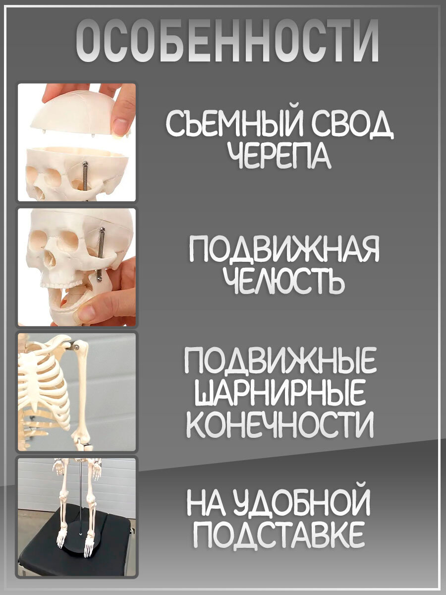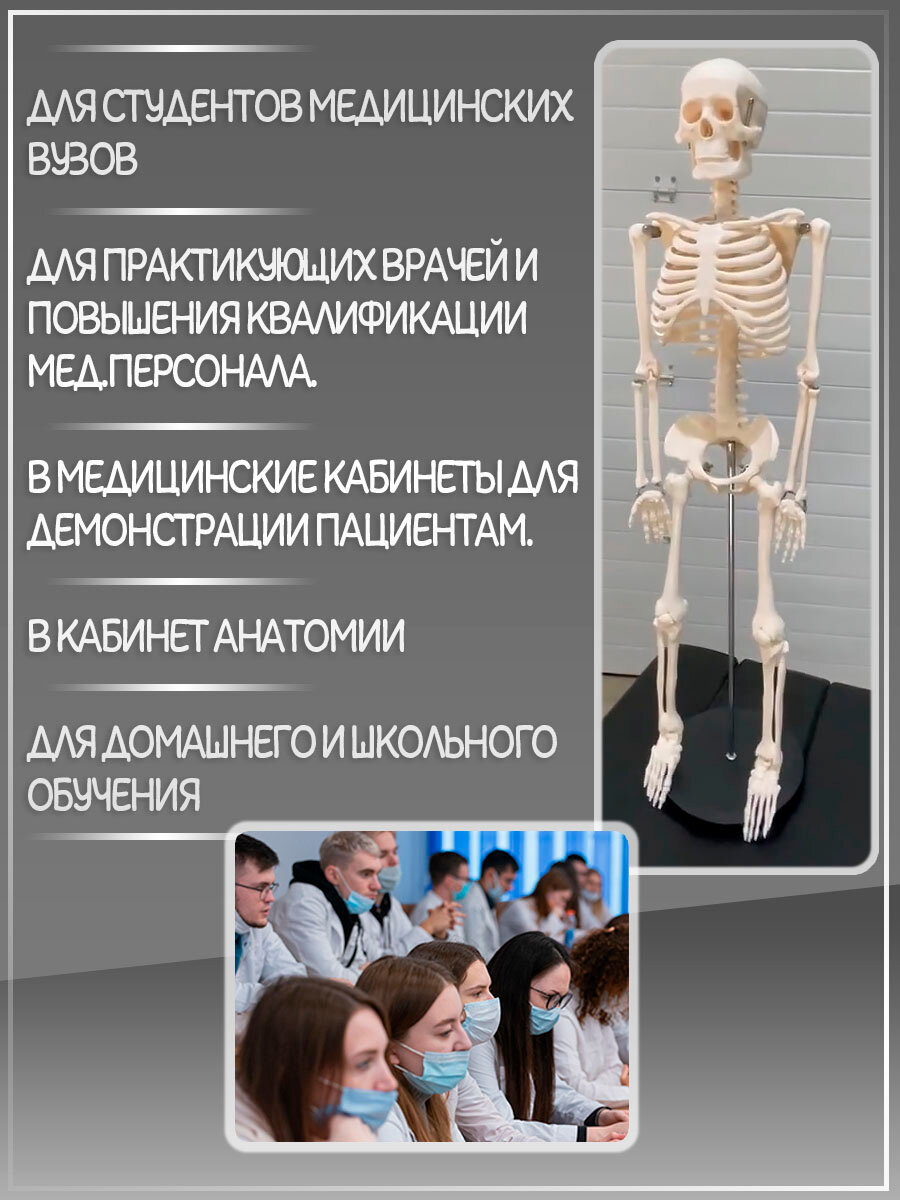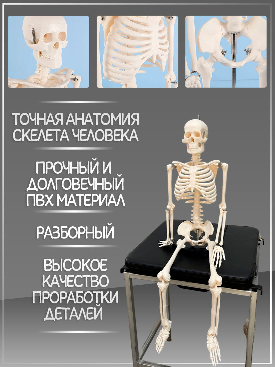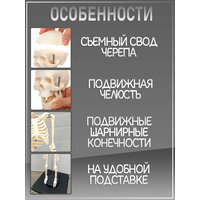 Анатомически точный скелет человека подходит для использования в общеобразовательных школах, средних и высших медицинских учебных заведениях, идеальна для лекций, практических занятий и семинаров по анатомии, помогает студентам лучше понять строение человеческого тела и функции различных систем.