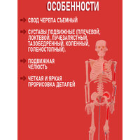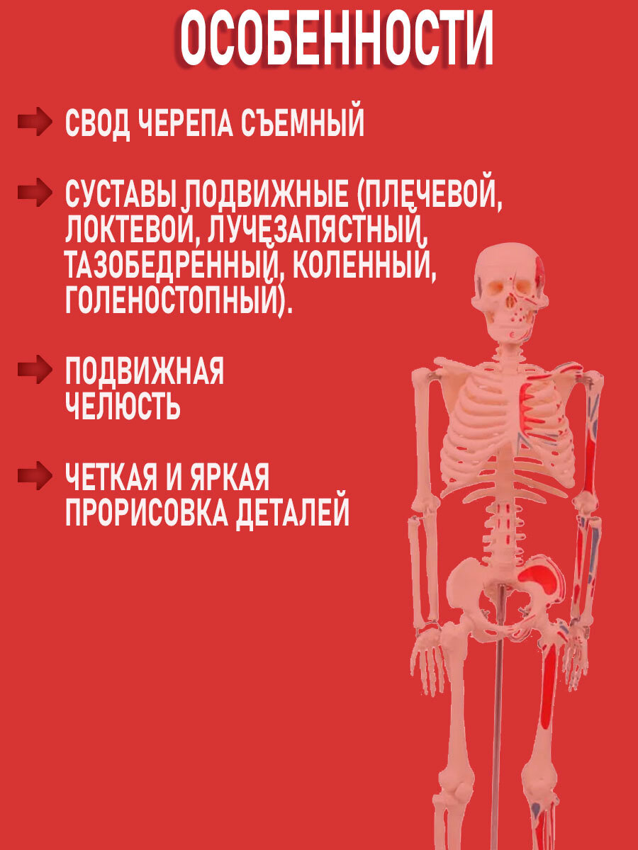Одной из ключевых особенностей данной модели является наличие подвижных суставов, включая плечевой, локтевой, лучезапястный, тазобедренный, коленный и голеностопный суставы. Это дает возможность демонстрировать движения и функциональные аспекты человеческого скелета. Анатомическая модель скелет человека также снабжена устойчивой стойкой, которая обеспечивает надежную установку на поверхности, позволяя использовать её в различных условиях обучения.