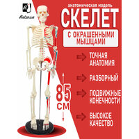 Модель скелета взрослого человека, выполненная в уменьшенном масштабе с высотой 85 см, представляет собой высококачественное анатомическое изделие, предназначенное для образовательных целей. Скелет 3д состоит из анатомически точных моделей основных частей человеческого тела, включая череп со съемным сводом, позвоночник, грудную клетку, таз, а также верхние и нижние конечности. Все конечности являются съемными, что позволяет легко демонстрировать различные анатомические аспекты.