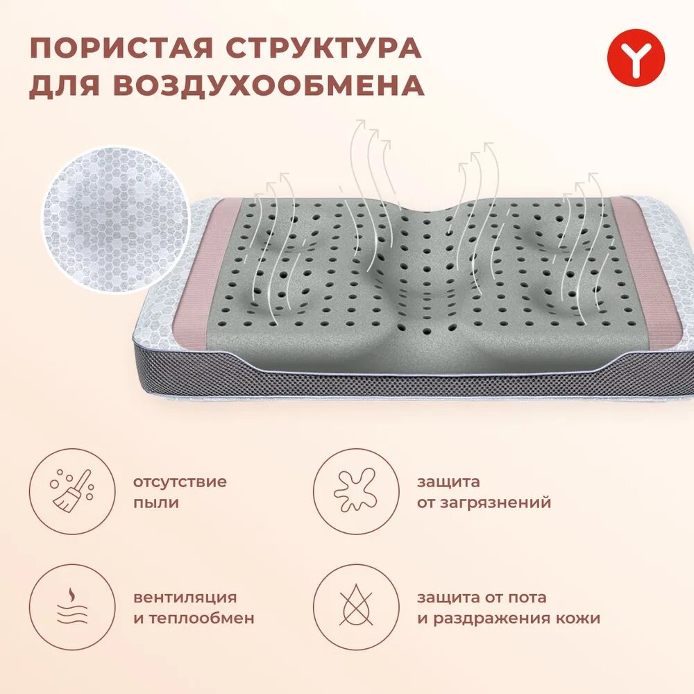Подушка ортопедическая Yamaguchi BIO-Based Zero Pillow с технологией зонированного распределения давления во время сна поддерживает естественные изгибы шеи и шейного отдела позвоночника в физиологически правильном положении, минимизирует деформацию лица во время сна, препятствует появлению морщин и утренней отечности. Подушка для сна от бессонницы с пористой сотовой структурой обеспечивает вентиляцию и теплообмен прилегающих к подушке участков кожи, что позволяет избежать их запотевания и последующего раздражения.