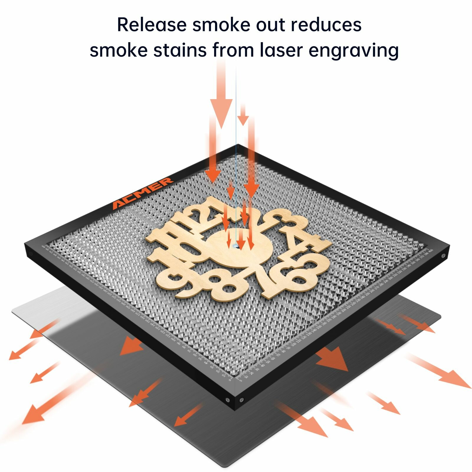 Удобный дизайн для наблюдения: сотовый стол имеет очень удобную конструкцию для резки и наблюдения. Когда лазер прорезает древесину или акрил, металлическая пластина в нижней части сот будет излучать яркий свет, что означает, что резка проникла внутрь. Решите проблему, связанную с тем, что на обычном гравировальном станке трудно судить о том, прорезается ли он.