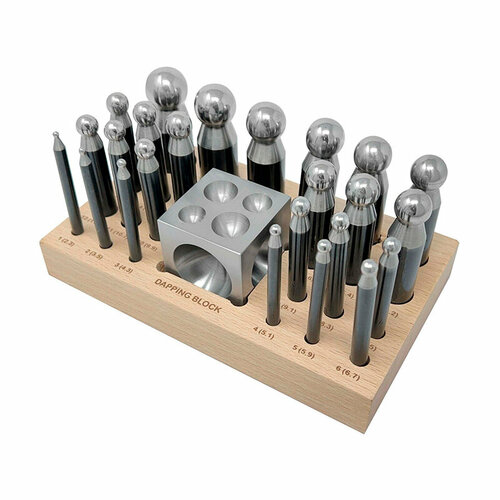 Анки и пунзеля применяются для сгибания, придания вогнутых / выпуклых форм, для бухтировки, для выколотки полусфер и создания пустотелых шаров из листового металла. Набор: Пунзеля 24 шт, размер от Ф2,3 до 25 мм. Анка куб 50x50 мм, имеет 18 углублений размером от Ф5 до 41 мм изготовлена из стали. Твердость - HRC 50.55 Инструмент предназначен для работы с мягкими металлами и сплавами. Подставка выполнена из бука с нанесением маркировки.