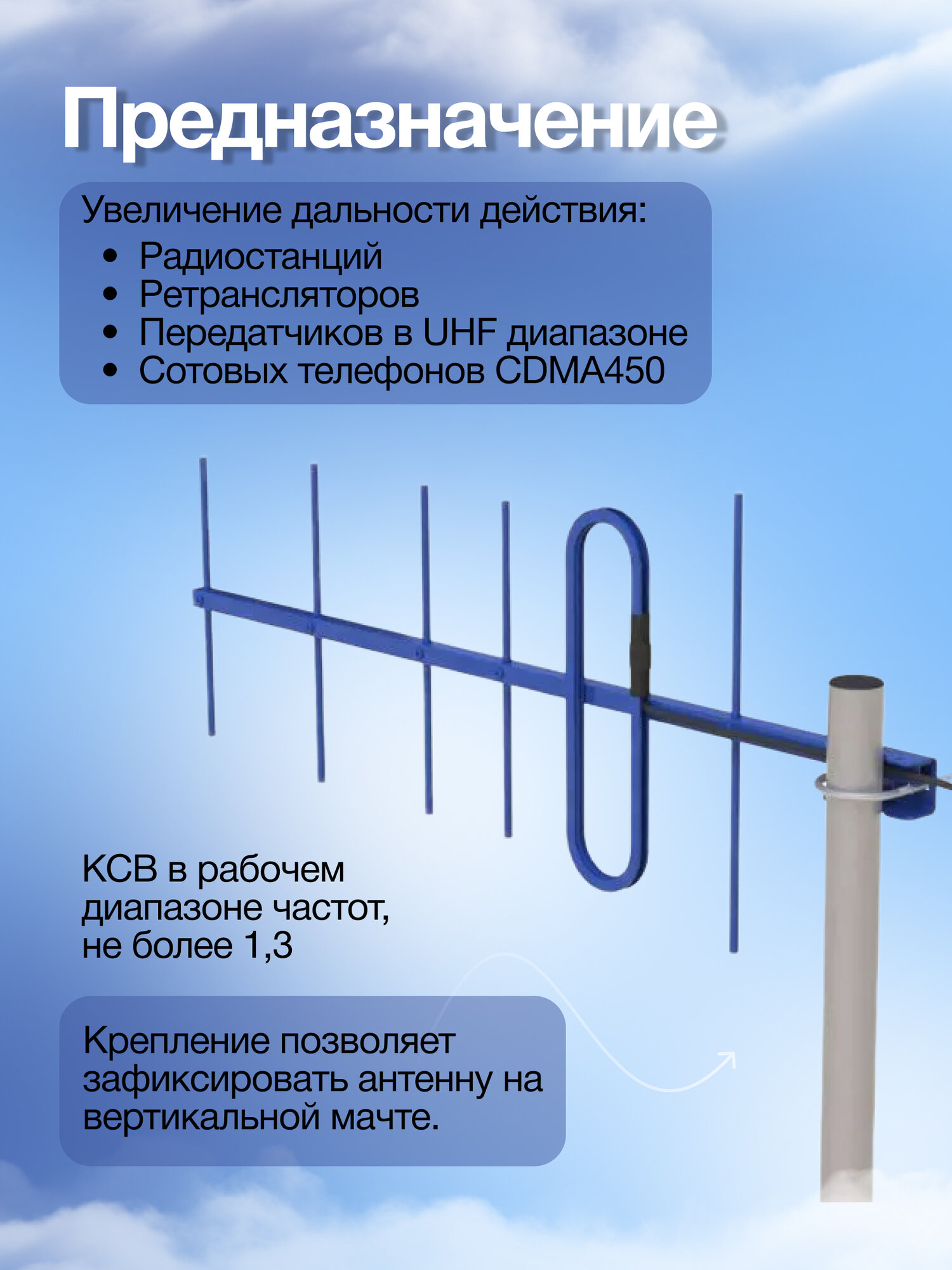 Антэкс AX-410Y - это направленная Yagi антенна, разработанная для увеличения дальности действия радиостанций UHF и сотовых телефонов CDMA450. Она также может быть использована в системах радиоохраны.