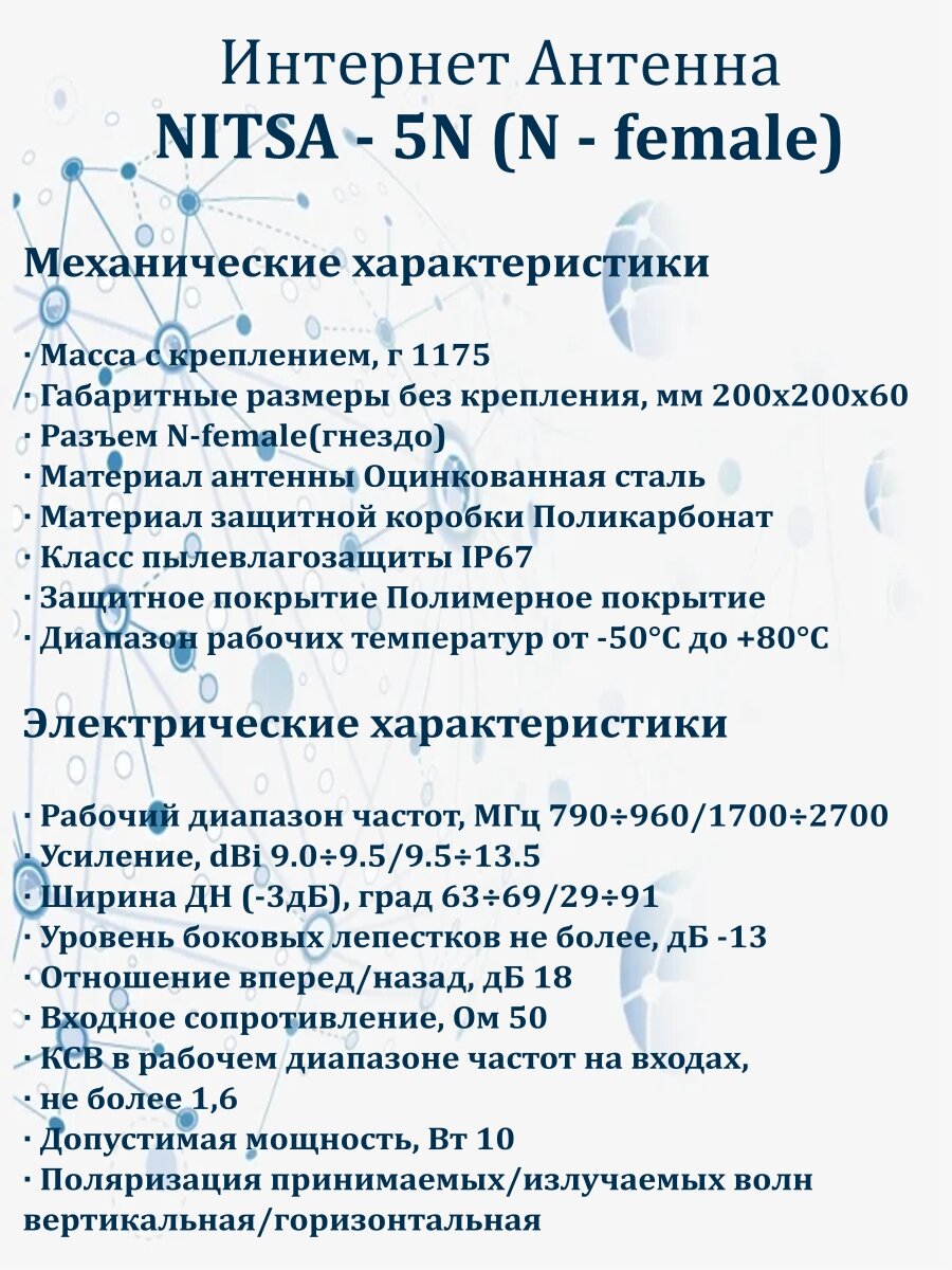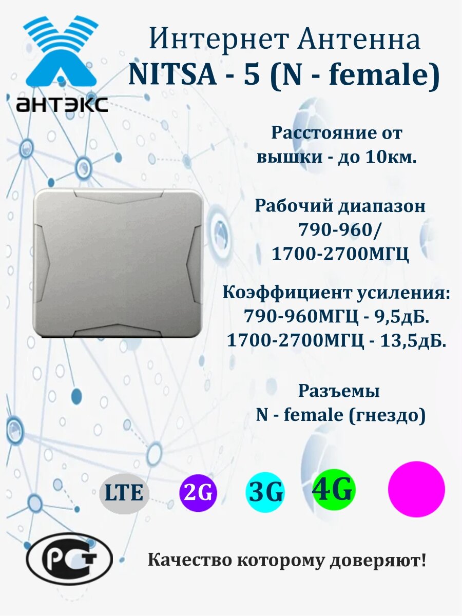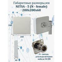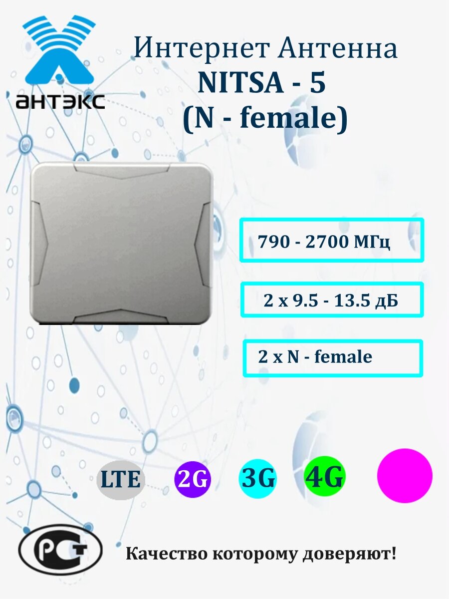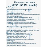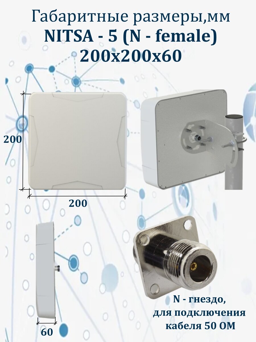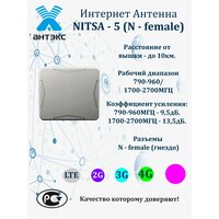 Универсальная выносная антенна NITSA-5 предназначена для использования в комплекте c сотовыми телефонами, модемами или репитерами стандартов LTE800/GSM900/GSM1800/ UMTS900/UMTS2100/ WIFI2400/LTE2600. Активные излучателя антенны укрыты в пластиковый корпус. Крепление позволяет изменять угол наклона антенны и наклон поляризации. Разъем подключения N-female.