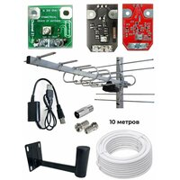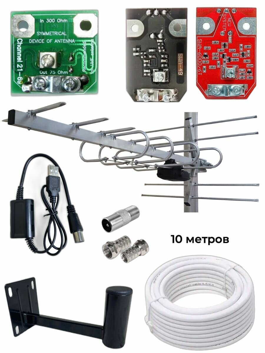 В комплекте с антенной идет кабель длиной 10 метров, кронштейн для крепления антенны к стене, что позволяет удобно разместить антенну на окне или балконе, а также обеспечивает достаточное расстояние для подключения к телевизору или цифровому приставке. Все штекера в комплекте. Три усилителя 69, 49, и 5v30 инжектор питания так же идет в комплекте.
