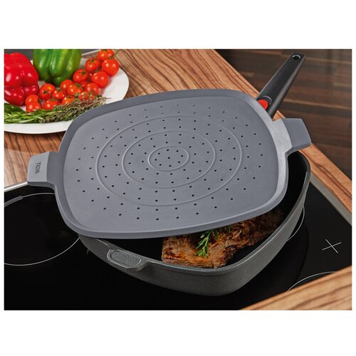 Многофункциональный силиконовый антиразбрызгиватель для сковороды или сотейника 28х28 см. Надежно защитит от жира и масленых капель рабочую поверхность плиты и кухни. Позаботится о сохранности Вашей столешницы от повреждений. Изготовлена из пищевого жаропрочного силикона - гипоаллергенного и безопасного с возможностью эксплуатации вплоть до 260°C. Просто и удобно поможет слить воду из кастрюли, оставив содержимое внутри, а удобные ручки ушки предохранят ваши руки от ожогов. Не впитывает запахи и легко моется в посудомоечной машине. Станет вам незаменимым помощником и сэкономит место на кухне. Многофункциональный силиконовый антиразбрызгиватель немецкого бренда WOLL займет достойное место среди аксессуаров на Вашей кухне. Оригинальный дизайн и немецкое качество исполнения не оставят равнодушными ни тех, кто любит готовить, ни опытных профессионалов-поваров.