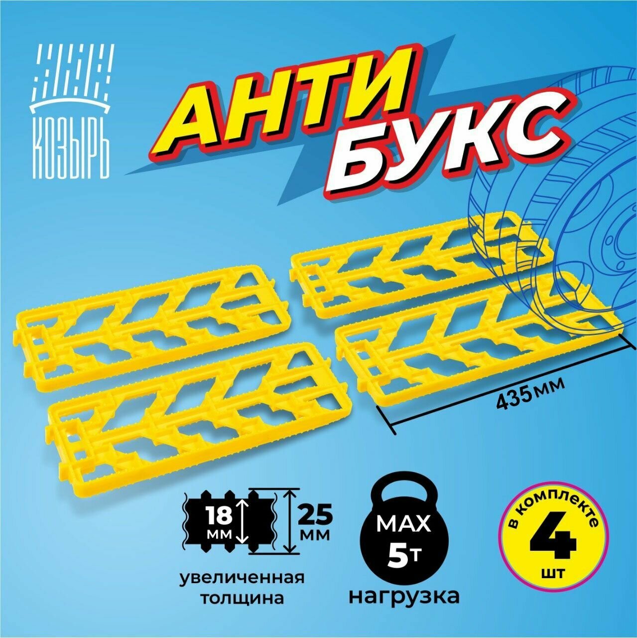 Антибуксы выдерживают вес до 5 тонн. Произведены из утолщенного и морозостойкого, но в то же время гибкого пластика, препятствующего скольжению лент. Антипробуксовочные ленты надежно соединяются между собой.