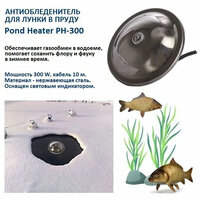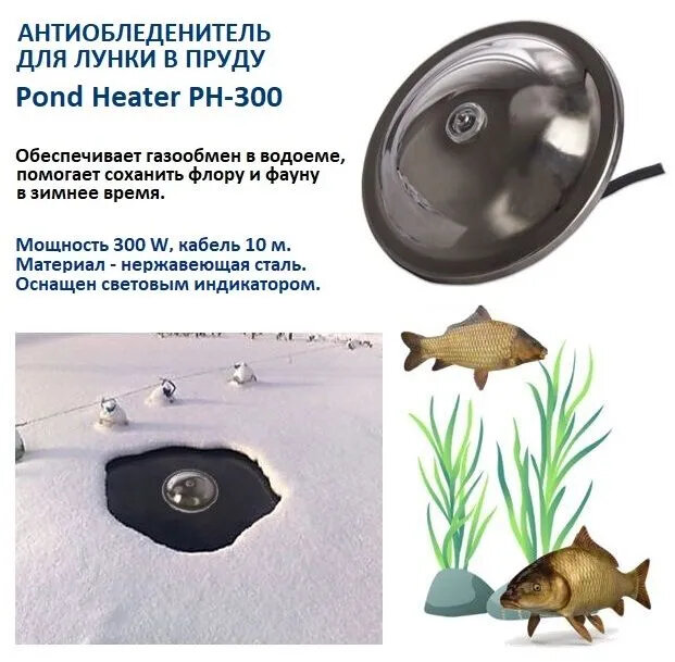 Антиобледенитель для пруда PH 300 нагревая воду вокруг себя размораживает лунку, что необходимо для газообмена в пруду и поддержания жизнедеятельности рыб в холодное время года. В комплекте кабель 10 м. Края лунки необходимо периодически очищать от льда и загрязнений. Во избежание замерзания лунки не оставлять прибор в воде в выключенном состоянии.Не допускается работа прибора не полностью погруженного в воду (до поплавка), это приведет к его поломке.