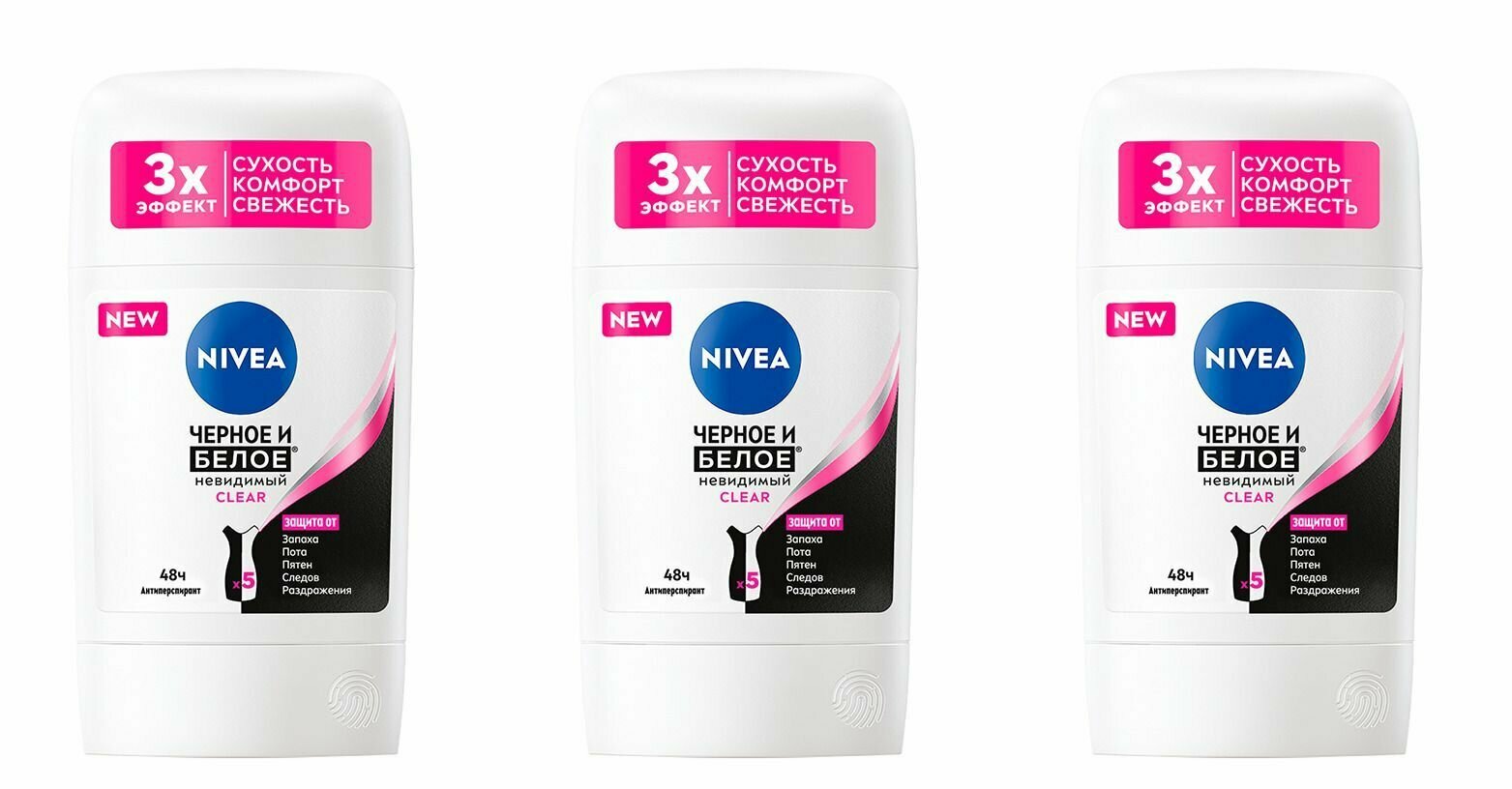 Купить Антиперспирант, Nivea, Clear, черное и белое, невидимый, стик, 50 мл, 3 шт с доставкой по всей России.