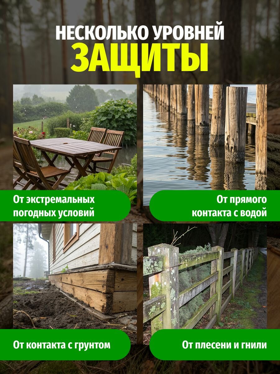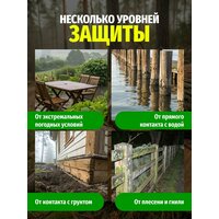 Предназначен для долговременной защиты древесины в экстремальных условиях эксплуатации, включая прямой контакт с водой, грунтом и атмосферными осадками.