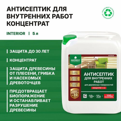 PROSEPT INTERIOR — антисептик на водной основе для внутренних работ. Предназначен для защиты древесины от действия дереворазрушающих и деревоокрашивающих плесневых грибов, насекомых-древоточцев. Антисептик способен как предотвращать бипоражение, так и останавливать уже начавшиеся процессы разрушения древесины биологическими агентами.