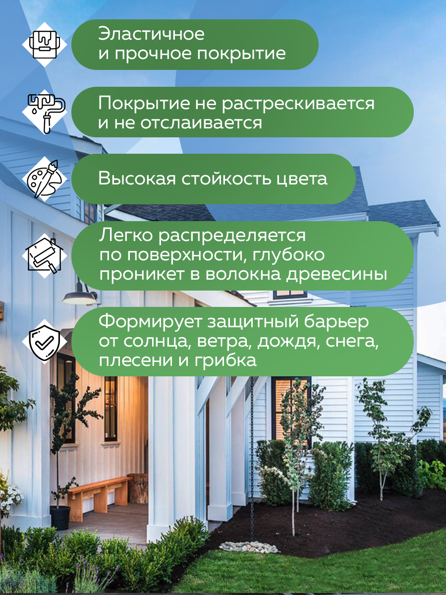 Пропитка для деревянных фасадов обладает прекрасной укрывистостью, стойкостью к выгоранию, создаёт надёжный барьер для возникновения грибка и плесени, защищает от агрессивного воздействия ультрафиолета и осадков.