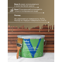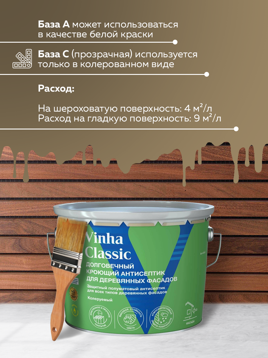 Антисептик Tikkurila Vinha Classic полуматовый представлен в базе VVA - белый, может использоваться в чистом виде или колероваться в светлые тона по каталогу Tikkurila «Vinha» и Tikkurila «Деревянные Фасады».