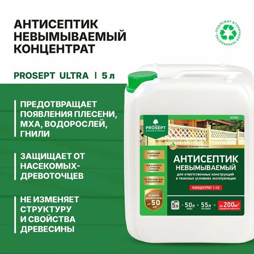 Антисептик невымываемый для ответственных работ Prosept Ultra для конструкций из древесины, эксплуатируемой в наиболее неблагоприятных условиях.