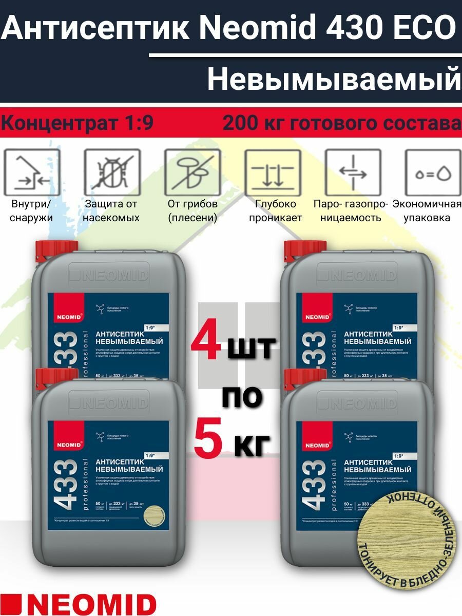 Купить Антисептик для дерева невымываемый усиленный NEOMID 433 5 кг 1:9, 4шт (200л готового раствора) цв Зеленый с доставкой по всей России. Антисептик для дерева невымываемый усиленный NEOMID 433 5 кг 1:9, 4шт (200л готового раствора) цв Зеленый: сравнение цен, характеристики, фото, актуальное наличие и цены.