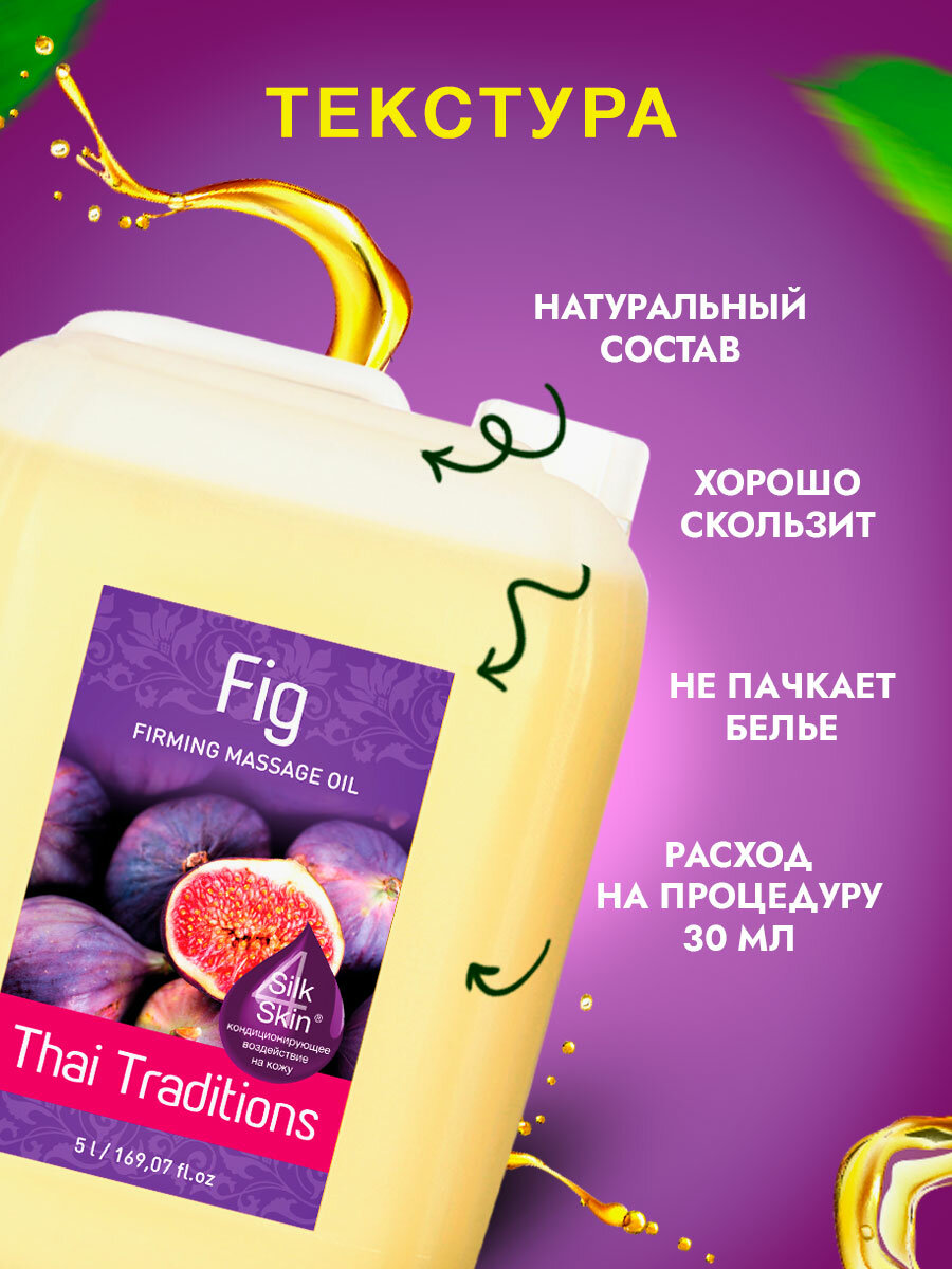Антицеллюлитное масло для массажа Инжир шаг за шагом поможет вам приобрести красивую фигуру без намека на целлюлит. Оно не оказывает разогревающего или охлаждающего воздействия, но при этом отлично укрепляет и подтягивает кожу, возвращает ей упругость и обеспечивает уход, улучшает ее внешний вид. Основа масажного арома масла - натуральное масло миндаля, авокадо, макадамии, зародышей пшеницы. В его состав входит также запатентованный кондиционирующий комплекс для ухода за кожей Silk4Skin из растительных экстрактов женьшеня, центеллы азиатской, гамамелиса, шалфея, эхинацеи, витамин Е. Масло парфюмированое (ароматизированное). Аромамасло обладает восхитительным фруктовым ароматом сочного инжира. Подходит для различных видов массажа: ручного, аппаратного, гуаша, с массажером, вакуумного, баночного масажа, массажа с щеткой. Масел существует очень много разных видов. Они могут различаться, например, по основе. Базовое масло может быть натуральное и синтетическое. Натуральные это: миндальное (масло сладкого миндаля), кокосовое (масло кокоса), виноградных косточек, рисовое, авокадо, амарантовое, хлопковое, жожоба, аргановое (масло арганы), абрикосовое, персиковое, какао, ши. Синтетические - минеральное (сухое), силиконовое, гидрофильное. В базовое масло обычно добавляются эфирные масла для ароматерапии, парфюмерные отдушки для придания нужного аромата, магний (магниевое масло), витамины, экстракты, афродизиаки. Выпускаются масла для разных частей тела: для лица, волос, ногтей, кутикулы, губ, рук, ног, спины, бровей и ресниц. Разные по назначению: для быстрого и ровного загара, уход после загара, защита от солнца, для солярия, для ванны и душа, для и после депиляции, для бани, солнцезащитное, несмываемое, мамло спрей, масло с шиммером. Конечно, по желаемому эффекту: антицеллюлитное, против растяжек, от целлюлита, для похудения, лимфодренажное, омолаживающее от морщин, разогревающее, питательное, защитное, восстанавливающее, для упругости, расслабляющее, гипоаллергенное, для борьбы с несовершенствами. По способу применения: массажное, профессиональное, интимное, эротическое, для секса, возбуждающее, доя маникюра и педикюра. Для разных категорий людей: для мужчин (мужское), женщин (женское), детей (детское), для младенцев, новорожденных, подростков, будущих мам (беременных). Масло Thai Traditions сочетает в себе бОльшую часть этих свойств. Оно способствует похудению, восстановлению упругости кожи, поддержанию хорошей формы, особенно в комплексе с обертыванием для тела и скрабом для тела, прекрасно заменяет сыворотку, крем и лосьон для тела. Представлено в разных объемах (флакон 100 мл, 250 мл, 700 мл, 5 л).