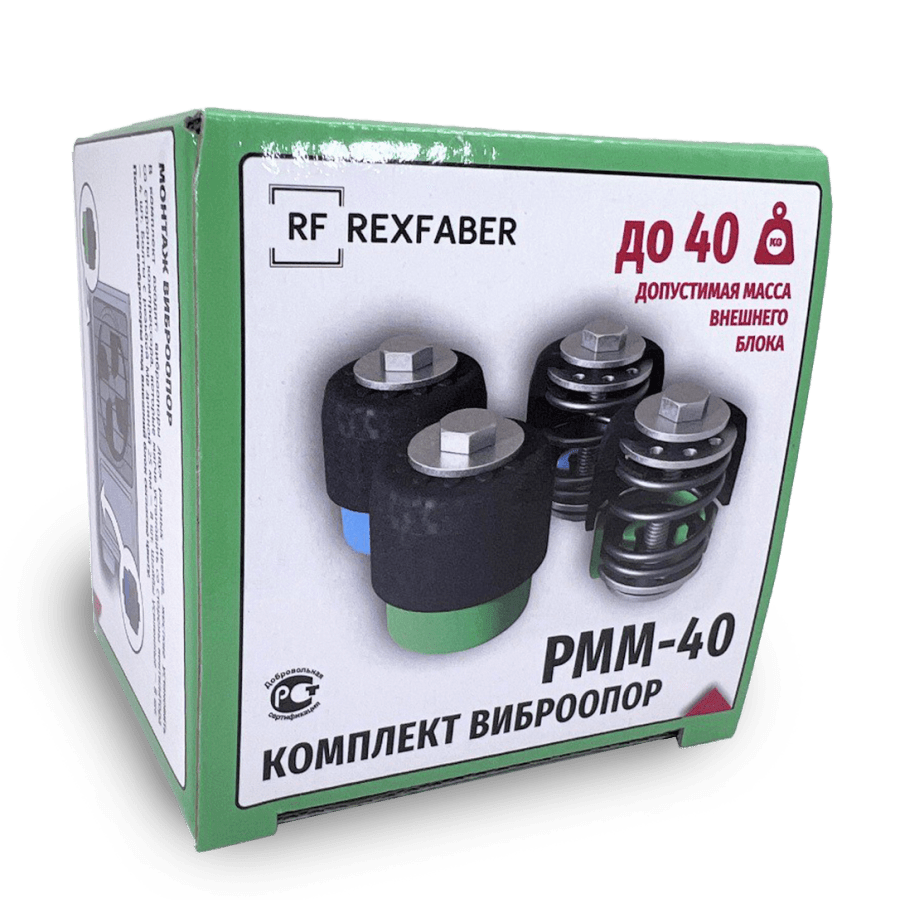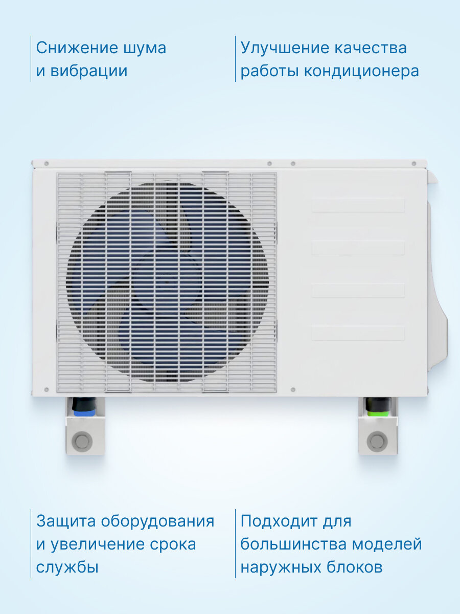 Виброопоры с пружинным демпфером изготовлены из высококачественного эластомера, имеющего высокую степень на разрыв. Они устойчивы к атмосферным воздействиям, к действию углеводородов, жиров органического происхождения, моющим и чистящим средствам, как на кислотной, так и на щелочной основе, а также спиртам, химическим основаниям и ультрафиолетовому излучению. Материал, из которого изготовлены виброопоры, обладает высокой электро- и термоизоляцией. Он рассчитан на диапазон температур от -50 до +120 °C. В комплект входят: виброопоры двух разных цветов, жесткие установлены со стороны компрессора, те, которые мягче, установлены со стороны вентилятора – 4 шт. Болты под резьбу М8 длиной 25 мм - 8 шт. Шайбы усиленные - 8 штук. Масса наружного блока : до 40 кг.