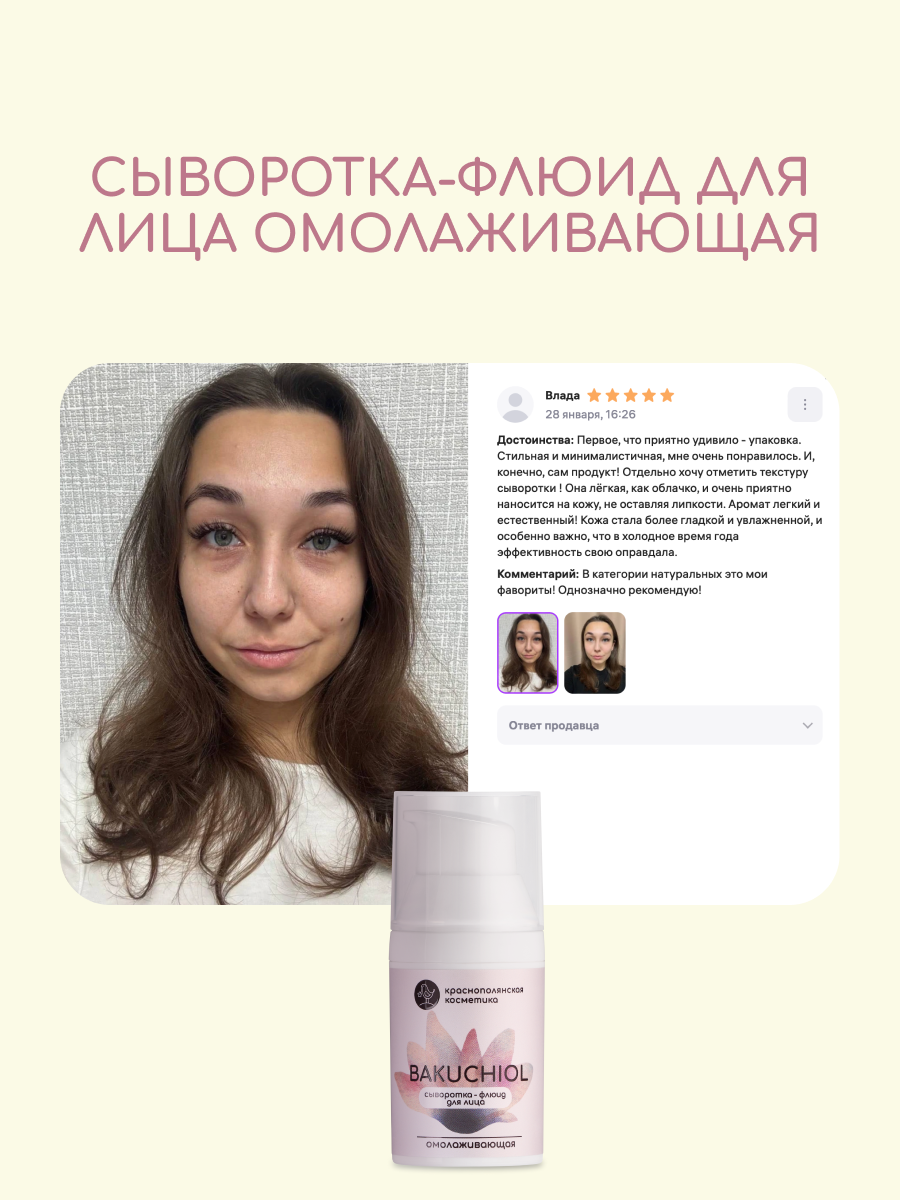 | Способ применения | нанести 2-3 капли сыворотки на очищенную кожу лица и шеи и распределить легкими движениями по массажным линиям. После рекомендуется нанести крем. |