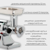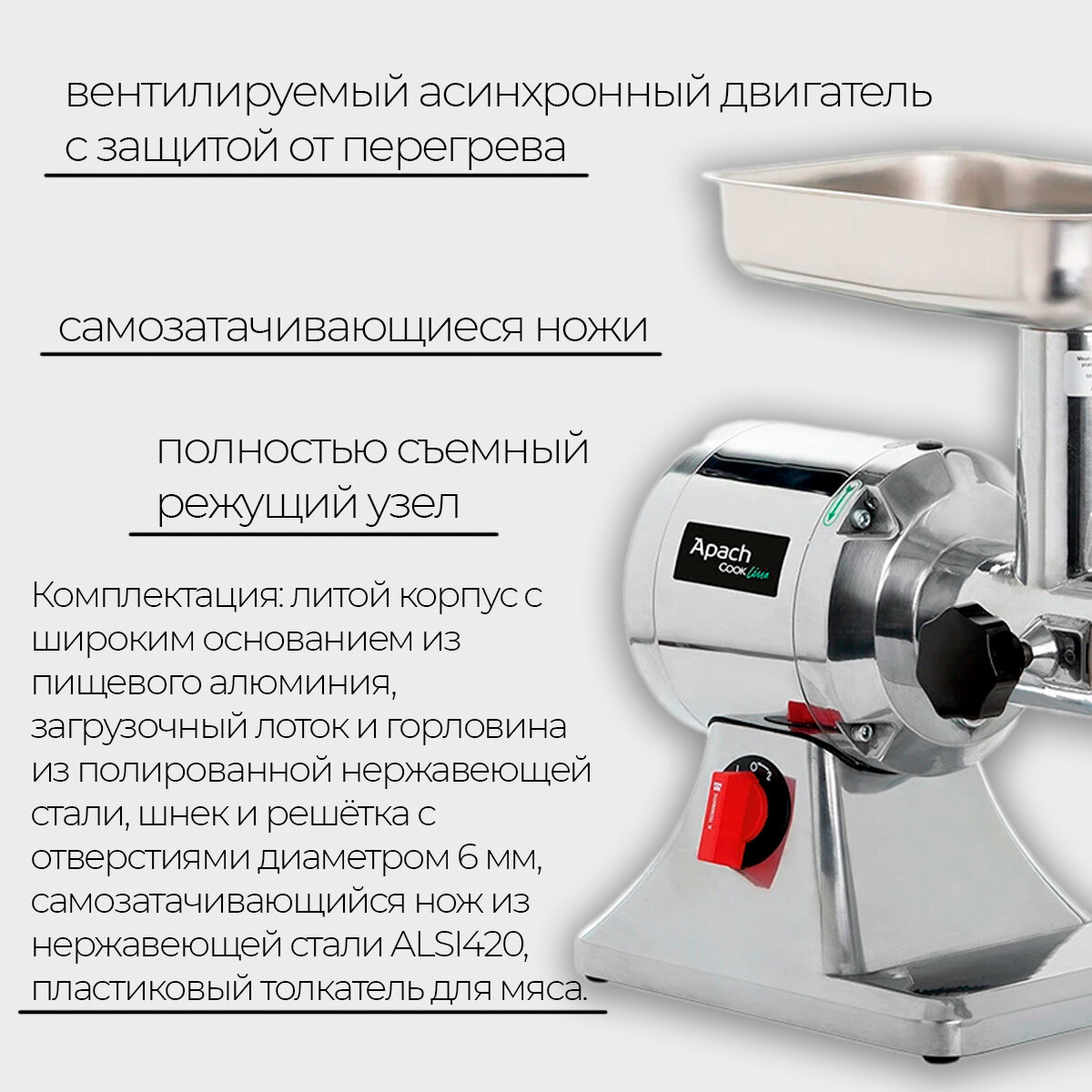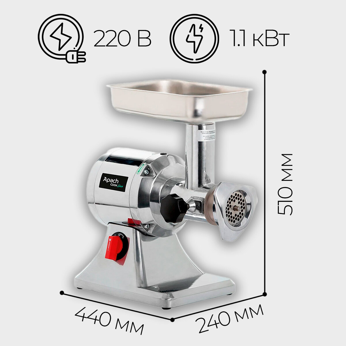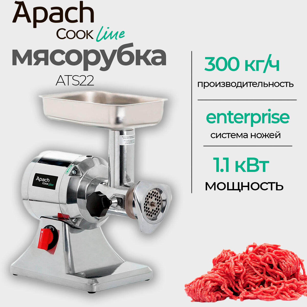 Электрическая мясорубка APACH Cook Line ATS22 предназначена для измельчения мяса, рыбы и других продуктов для приготовления большого ассортимента блюд. Мясорубочная часть и шнек изготовлены из пищевого чугуна, ножи, решётка, лоток и горловина – из нержавеющей стали, толкатель – из ABS-пластика.