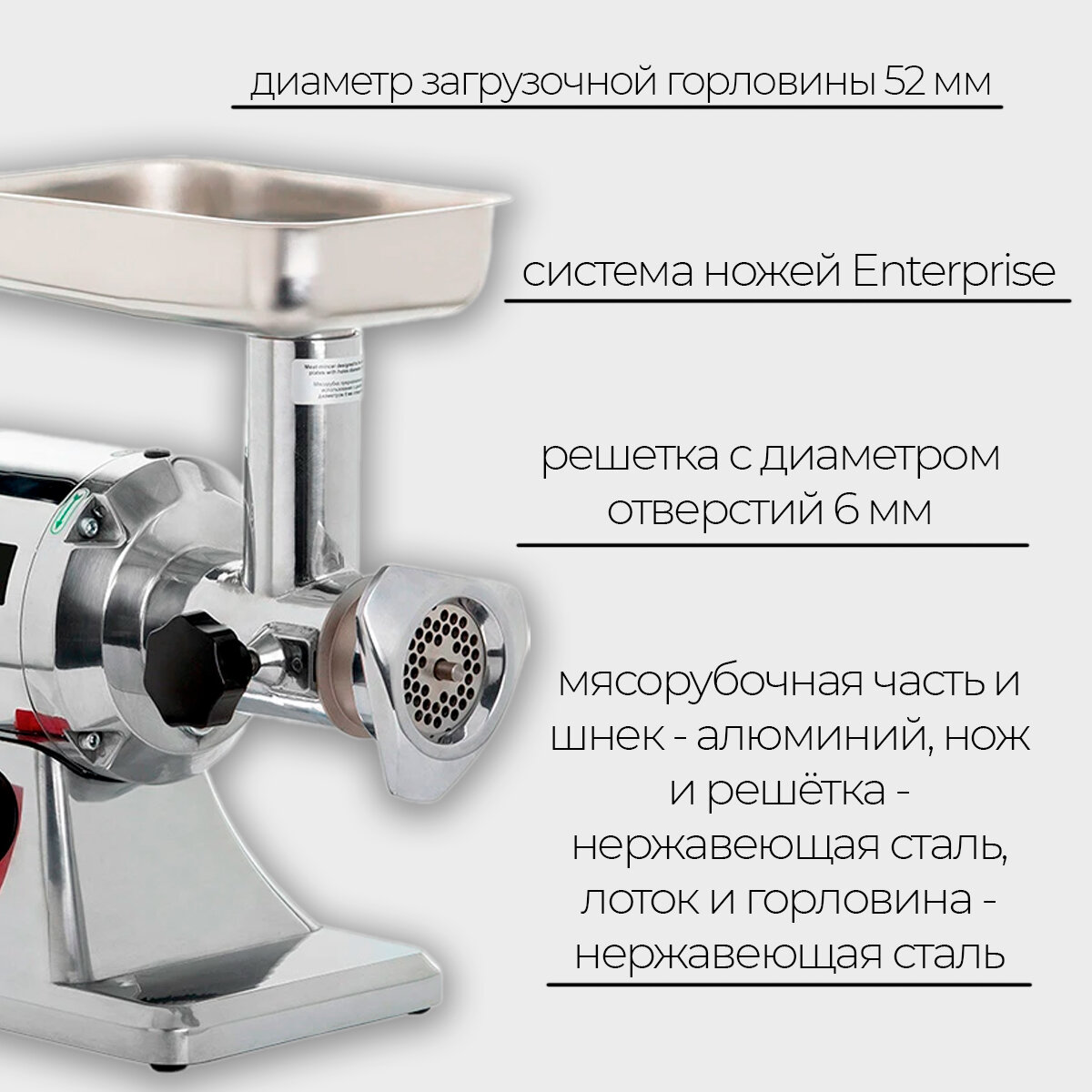 В комплект поставки входят решётка (с отверстиями диаметром 6 мм), самозатачивающийся нож.