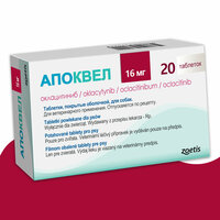 | Фармакологическое действие | Апоквел относится к лекарственным препаратам группы селективных ингибиторов янус-киназы (JAK). Оклацитиниба малеат, входящий в состав препарата, в терапевтической дозе угнетает функции провоспалительных, проаллергических и пруритогенных (зудогенных) цитокинов, зависимых от ферментативной активности янус-киназы JAK1 или JAK3, целенаправленное воздействие на которые позволяет ингибировать ключевые механизмы возникновения зуда, ассоциированного с аллергией, и способствует устранению симптомов местного воспаления; на цитокины, участвующие в кроветворении и зависимые от JAK2, существенно не влияет. При длительном применении в более высоких дозах оклацитиниб может вызывать угнетение лимфоидной ткани, ингибировать активацию Т-клеток посредством подавления сигнала на уровне рецепторов интерлейкинов IL-2, что характеризует фармакологическое действие соединений данного класса. После перорального введения препарата оклацитиниба малеат быстро всасывается в желудочно-кишечном тракте (биодоступность составляет 89 %), поступает в системный кровоток, достигая максимальной концентрации в плазме менее чем через 1 час, проникает в большинство органов и тканей, практически не метаболизируется, выводится из организма в неизмененной форме, преимущественно с мочой, период полувыведения составляет 3-4 часа. Апоквел по степени воздействия на организм относится к веществам умеренно опасным (3 класс опасности по ГОСТ 12.1.007) со слабо выраженными кумулятивными свойствами, в рекомендуемой дозе не обладает мутагенной, канцерогенной, эмбриотоксической и тератогенной активностью. |