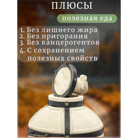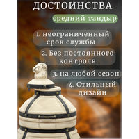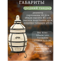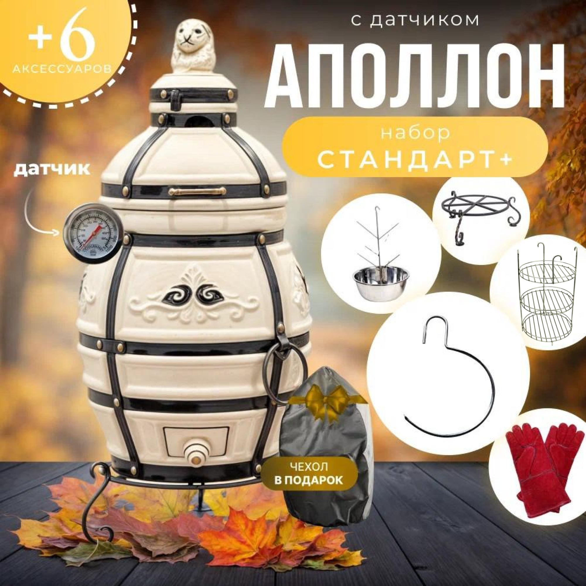 Переносной керамический тандыр разогретый в течение 1,5 - 2 часов долго отдаёт своё накопленный жар пище. Внутри достигается 900 ℃, что существенно сокращает время приготовления и сохраняет максимум полезных веществ. Вмещает до 8 вертеля за раз. За один розжиг можно приготовить: 3-4 закладки мяса, готовящегося по 20-30 минут; овощи, рыбку, хлеб, самсу. Толстые стеночки держат большую температуру около двух, трех часов." Аполлон" от бренда. Технокерамика, сделан в виде овального бочонка среднего объёма и имеет двухуровневую крышку. Колпачок, помогает не терять тепло при открывании, а откидная крышечка с комфортными ручками позволяет легко открывать и закладывать продукты. Выкованная ножка обеспечивает удобное использование. Красоту придаёт орнаментальный растительный узор, расположенный в центральной его части. В основном выполнен в бежевом цвете, коричневый добавлен в области орнамента, а на него нанесена глазурь, которая защищает его от влаги и грязи. Изготовленный из шамотной глины высокотемпературного обжига он обладает высокой теплопроводностью, экологичностью, прочностью и долговечностью более 10 лет. Отличается современным дизайном, который впишется в любой интерьер и отлично подойдет на подарок мужчине на день рождения.