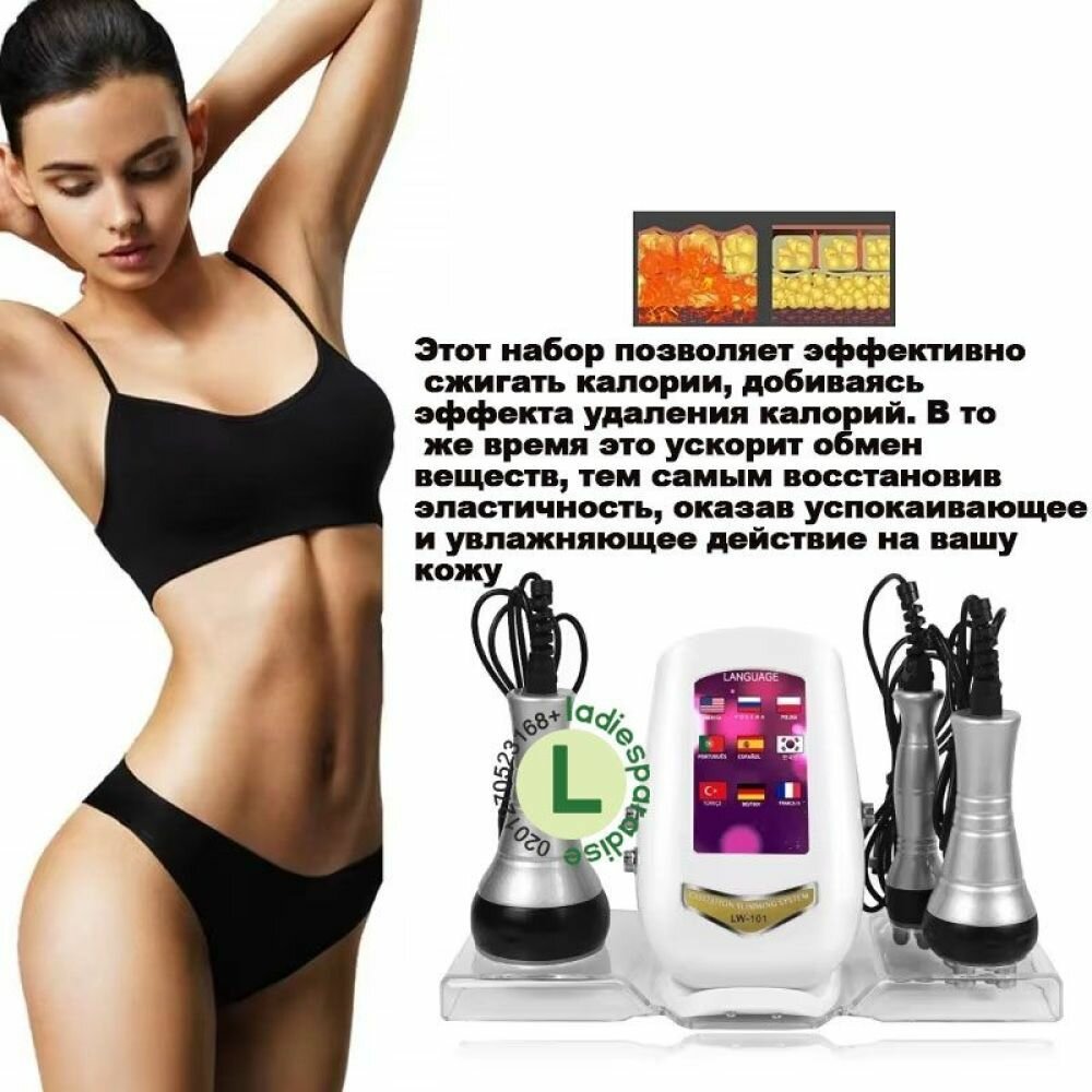 Данный аппарат представляет собой компактный и удобный прибор для проведения косметических процедур таких как, кавитация (ультразвуковая липосакция) и радиолифтинг в домашних условиях на профессиональном уровне. Аппарат позволяет избавиться от целлюлита на любой стадии, уменьшить излишние жировые отложения, сократить объемы в талии и на бедрах, тем самым способствуя похудению и коррекции фигуры. Этот косметический прибор помогает бороться с дряблостью кожи, возрастными изменениями, растяжками на животе, ногах, руках и ягодицах. Данный аппарат для массажа оснащен 3 насадками/манипулами со следующими функциями: ультразвуковая кавитация по телу, радиолифтинг по телу (мультиполярная манипула) и радиолифтинг по лицу (триполярная манипула) Сеансы кавитации безопасны и безболезненны. Кожа после сеанса станет подтянутой и упругой. Эффект воздействия специальной насадкой аппарата заключается в разрушении мембран жировых клеток при помощи ультразвуковых волн. Ультразвук вызывает колебательные движения молекул, из-за чего они нагреваются и начинается процесс кавитации, то есть образования микропузырьков. Кавитационные микропузырьки лопаются, словно воздушные шарики, и жир превращается в жидкость. В свою очередь высвободившийся из клеток жир легко выводится из организма с лимфотоком. Процедура обязательно проводится курсами, с индивидуальной периодичностью. Кавитация позволяет добиться заметного улучшения и омоложения кожи ее эластичности и тонуса, создание четкого контура (овала лица), устранения второго подбородка, разглаживания морщин, устранение недостатков у проблемной кожи, требующей лечения, изменения структуры кожного покрова, с устранением последствий угревой сыпи, уменьшения количества, величины рубцов и растяжек, излечения целлюлита и очищение кожи от локализированных жировых отложений. С помощью вакуумного массажного воздействия эффективно избавляются от целлюлита и увеличивают тонус кожи. Лифтинг (RF lifting) в аппарате представлен двумя насадками – подтяжка и лифтинг достигается благодаря действию радиоволн, которые прогревают поверхностные слои кожи и вызывают термолиз, который и запускает процесс обновления кожи. В течение 6 месяцев происходит выработка нового коллагена, повышается эластичность кожи и визуально разглаживаются морщины. Аппарат зарекомендовал себя как один из лучших в сфере индустрии красоты и эффективно помогает вернуть молодость или удержать ее как можно дольше. Благодаря данному аппарату, Вы справитесь со многими эстетическими проблемами, сделаете кожу более подтянутой, добьетесь омолаживающего эффекта, а значит Вы всегда будете выглядеть молодой, красивой и желанной женщиной.