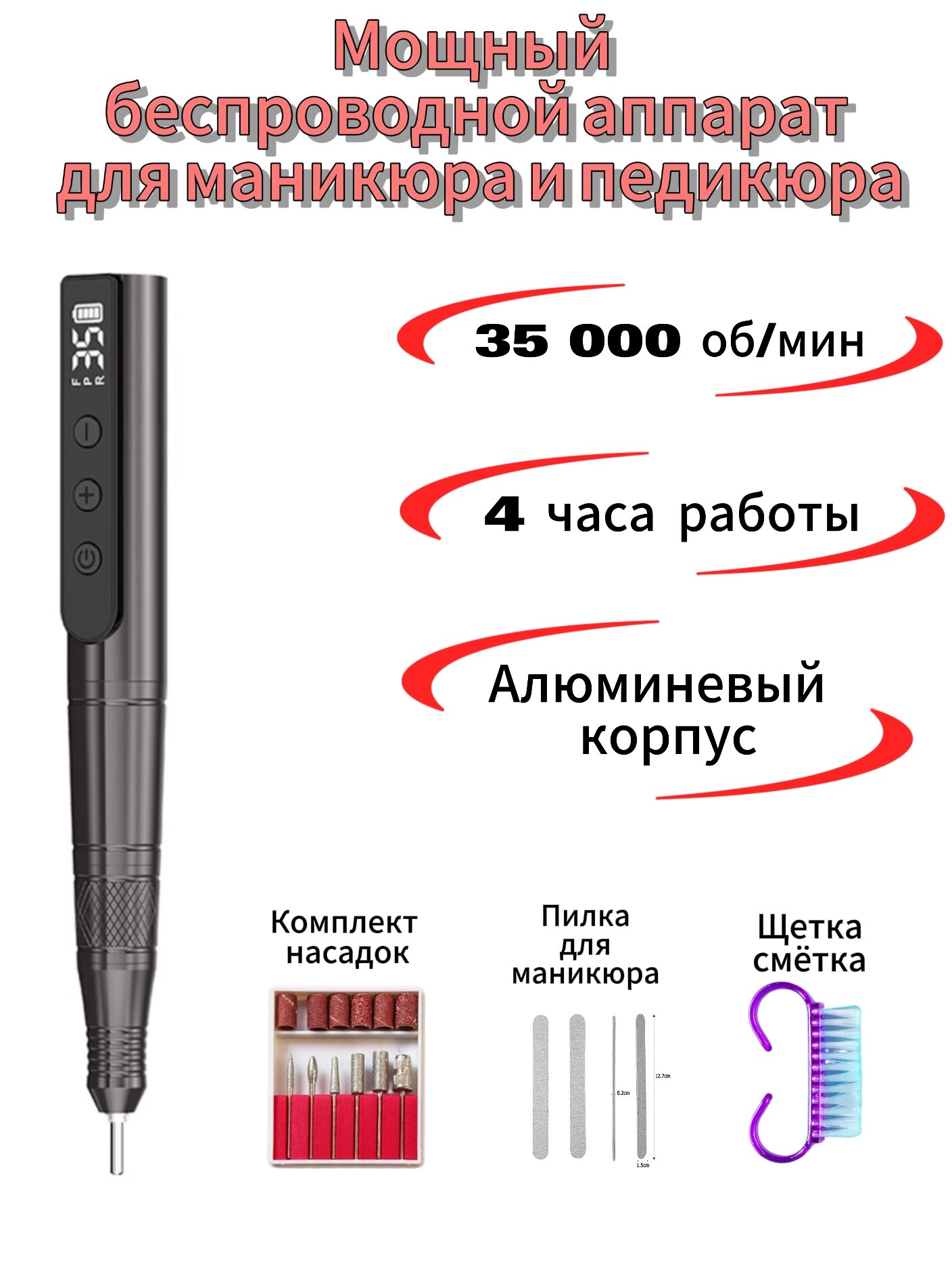 Представляем вам новинку — мощный и профессиональный беспроводной аппарат для маникюра и педикюра. Машинка-рукчка для маникюра станет вашим надёжным помощником в уходе за ногтями и кожей рук и ног. Несмотря на свои компактные размеры, этот аппарат для маникюра и педикюра обладает высокой мощностью — 35000 оборотов в минуту. Алюминиевый корпус машинки для маникюра защищает инструмент от повреждений, и перегрева, обеспечивая долгий срок службы. Мощный аккумулятор емкостью 1100 MH позволит вам отработать до 4 часов. После чего его можно быстро зарядить машинку для педикюра и маникюраза 40 минут. Благодаря мощному двигателю и 35 режимам скорости, вы сможете легко и быстро обрабатывать ногти и кутикулу. Даже если у вас жёсткие или слишком тонкие ногти, этот аппарат справится с задачей без проблем.