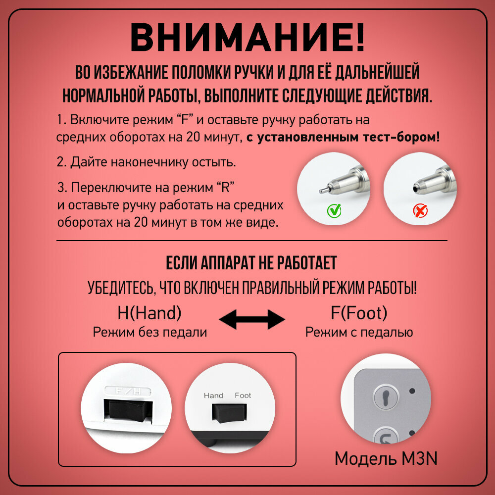 1. Держите наконечник на подставке, чтобы избежать падения. 2. Не используйте погнутые фрезы, что приводит к быстрому износу наконечника 3. Соблюдайте скоростной режим, чем больше диаметр фрезы, тем меньше скорость вращения. 4. Выключайте аппарат из розетки, если закончили работу.