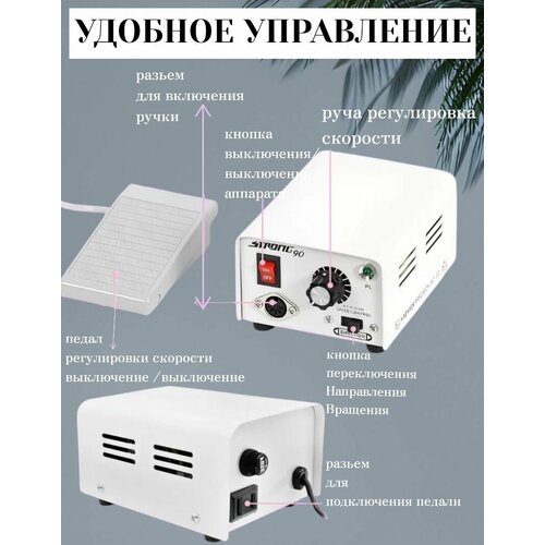 Аппарат для маникюра и педикюра - средство (техника) для профессионального и бытового применения. Предназначен для проведения маникюрных и педикюрных процедур: снятия гель лака (шеллака), ухаживать за кожей, удаления кутикулы, коррекции наращенных ногтей, полировки, обработки, натоптышей, мозолей, чистка и шлифовка пяток. Насадками для аппарата пользуются не только мастера nail индустрии, но и обычные девушки в домашних условиях. Регулятор скорости вращения фрез поможет выбрать режим под себя. Функция реверса позволяет использовать фрезы с двойной насечкой. Прибор оснащен защитой от перегрева. Сменные фрезы надо чистить от частиц кожи и гель лака при помощи щеточки/щетки, хранить их лучше в пенале. У ручки держателя удобная эргономичная форма и небольшой вес, оборудована удобной подставкой. Кроме того, достоинством аппаратов Strоng является то, что наконечники оснащаются воздухозаборником, благодаря которому происходит охлаждение микромотора. Не менее важное преимущество приборов - это возможность максимально быстрой смены насадок - всего 3 секунды. Фреза надежно фиксируется цанговым зажимом в наконечнике и не проворачивается во время работы. Портативная машинка для маникюра имеет низкий уровень шума и отсутствие вибрации при выполнении работ. Маникюрный аппарат обрабатывает кутикулу и боковые валики, корректирует гелевые и акриловые ногти. Машинка для маникюра встроенным предохранителем для защиты от перегрузок, охлаждением для комфортной и длительной работы. Аппарат для маникюра и педикюра оборудован регулятором оборотов с плавным переходом от минимального до максимального режима. Это современный прибор, для обработки натуральных и искусственных ногтей. Аппарат работает от сети (от розетки), питания 220В. Машина легка в работе с простым дизайном. Корпус аппарата из высококачественного металла. Mодель Strоng 90, 204 и 210 прибор для проведения процедур маникюра и педикюра, мощность 65 Вт, скорость вращения 35000 об./мин.