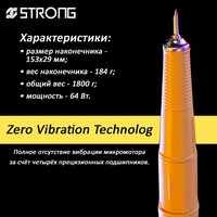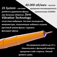 Наконечник: скорость вращения 40 000 об/мин, габариты 153х29 мм, вес 184 г. 2S System - система двойного удержания фрезы при больших оборотах. Zero Vibration Technology - отсутствие вибрации. Система охлаждения микромотора, позволяющая избежать нагрева. Цанговый зажим фрезы: надежно фиксирует фрезу и позволяет поменять её за 3 сек. Беспрерывная работа до 12 ч. Наконечники с функцией реверса: вращение в обе стороны, использование специальных фрез. Низкий уровень шума.