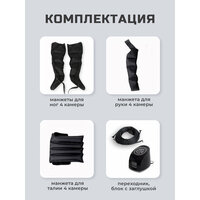Примечание: устройство автоматически выключается через 15 минут. Не используйте массажер более одного часа. Противопоказания: нарушение целостности кожных покровов на участках, соприкасающихся с манжетами аппарата. Не является медицинским аппаратом! Перед использованием проконсультируйтесь с врачом! В комплекте предоставляется инструкция.
