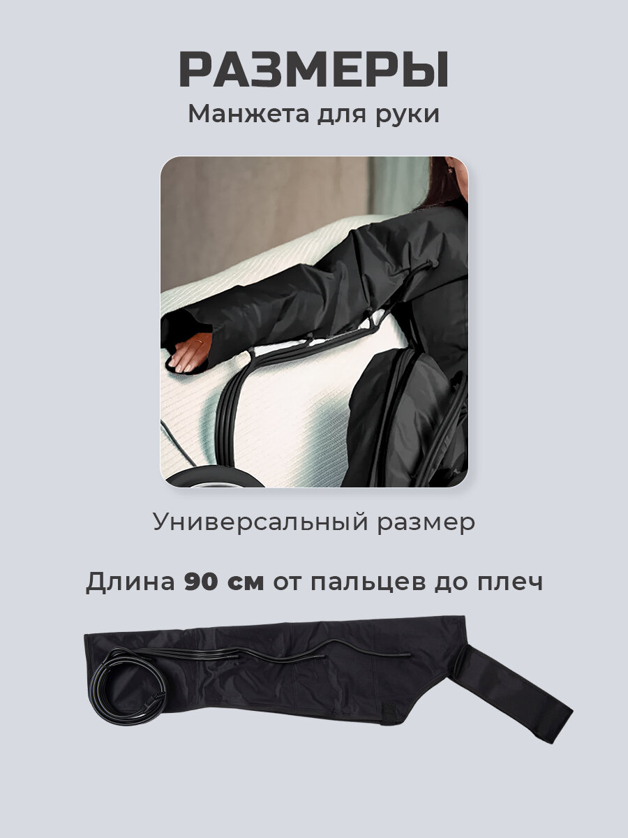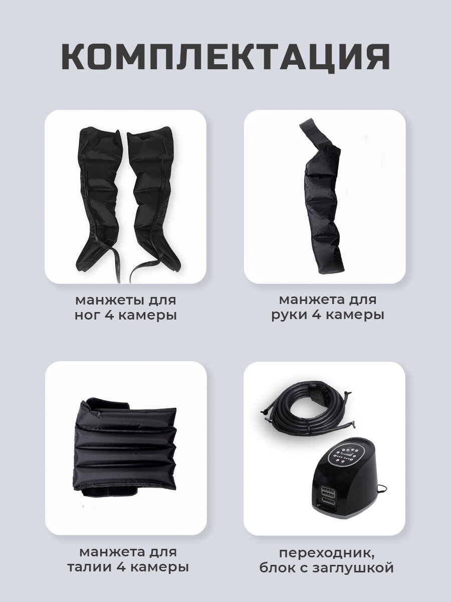 Массажер поможет расслабить мышцы, избавить от отчетности и тяжести в теле за несколько сеансов. Прессотерапия — одна из самых эффективных процедур для коррекции фигуры. С ее помощью удается достигнуть быстрых положительных изменений внешности, нормализовать работу внутренних органов, сохранить здоровье. Аппаратный массаж позволяет за несколько сеансов добиться результата, который не всегда достигается даже путем использования специализированных лекарств и физической культуры. Манжеты выполнены из прочной и эластичной ткани, внутри имеются воздушные камеры. В эти камеры начинает нагнетаться воздух, в результате оказывается деликатное давление на мягкие ткани и мышцы. Полный курс включает 15–25 процедур, один раз в 2–3 дня и позволяет достичь следующих результатов: