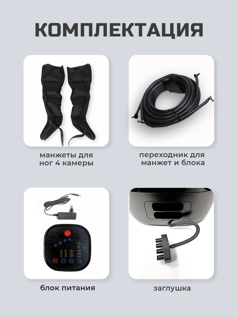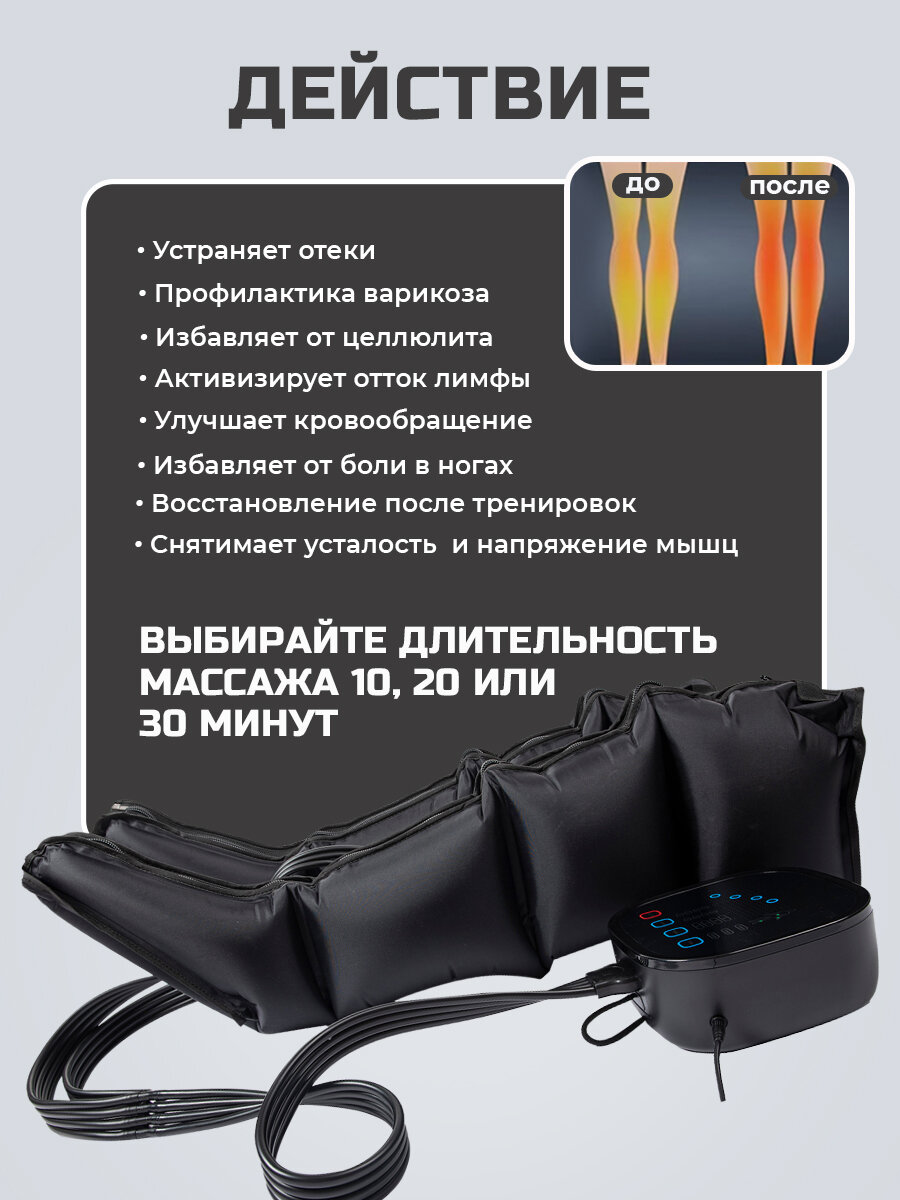 Представляем компрессионный relax массажер. Такой уникальный аксессуар, лимфодренажный массажер для ног - незаменимая вещь для тех, кто сталкивается с болью в ногах после трудового дня или испытывает дискомфорт в суставах после физических напряжений. Наш мощный электромассажер уменьшает отечность, снимает усталость и болезненные ощущения, дарит блаженство. Лечебное применение чулок для разгона лимфы основано на использовании метода прессотерапии (воздушно-компрессионного массажа) - замечательный стимулятор кровообращения. Электрический аппарат для лимфодренажа укрепляет стенки сосудов. Является прекрасной профилактикой против варикоза, общего оздоровления и восстановления организма. Компрессия повышает эластичность мышц и связок стоп, подготавливает их к нагрузкам, избавляет от спазмов и отеков, а также стимулирует детоксикацию и помогает в программах коррекции фигуры. Электроприбор для антицеллюлитного массажа имеет 4 режима действия, воздушные манжеты захватывают стопы, голени и бедра. Легко управляется с помощью блока питания - есть возможность выбора зоны и интенсивности воздействия, а также режима работы. Обладает компактными размерами и удобно транспортируется. Лимфодренажный массажер для ног подходит для дома, офиса и поездок. Отличный вариант подарка родных, друзей и всех любителей спорта, на день рождения и 8 марта. Женщины забудут про проявления целлюлита, а мужчины про стресс и судороги. Он подойдет для людей любого возраста, мужского и женского пола. Удобство, комфорт, релакс и непревзойденная эффективность для улучшения вашего здоровья и похудения бедер ваших ножек. Идеальный подарок для любимых на 8 марта.