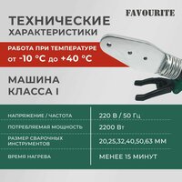 КомплектацияАппара для сварки трубНабор насадокКлючКейсХарактеристикиБренд - FAVOURITEПотребляемая мощность (Вт) - 2200Диапазон рабочей температуры (Град. цельс.) - 50 — 300Время нагрева до рабочей температуры (мин) - 15Регулятор температуры - НетРазмер сменных насадок - 20, 25,32,40,50, 63Компактная конструкция - ДаНебольшой вес - ДаСпециальное покрытие насадок - Да