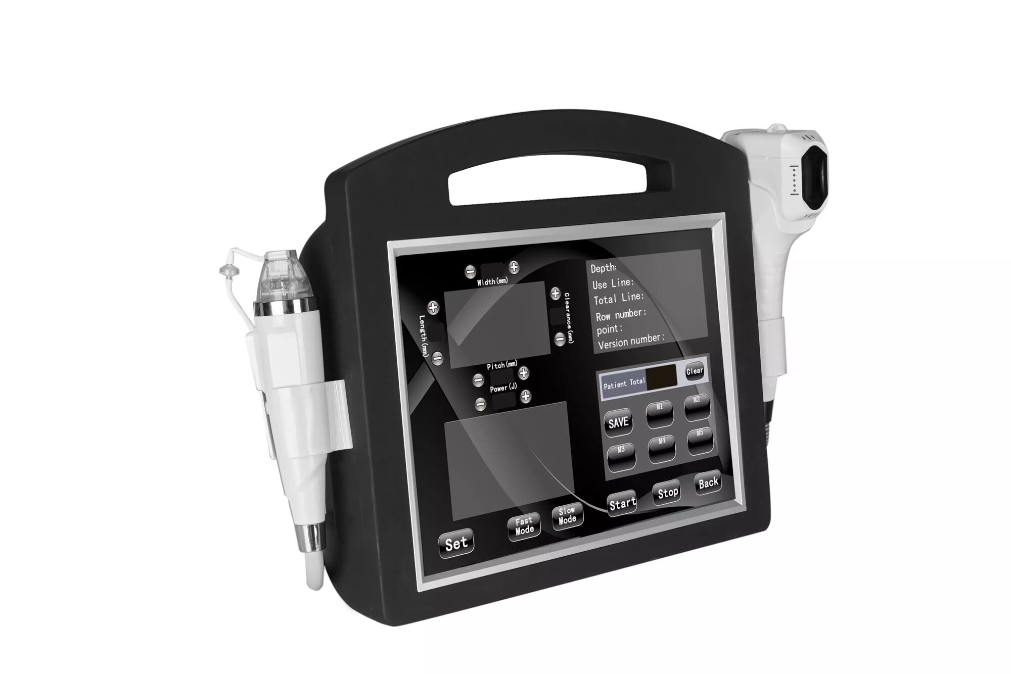 - Длина игл регулируется в меню настроек и зависит от толщины кожи на обрабатываемой области (например, на животе длина от 1 до 3 мм, на лице от 0,5 до 1,5 мм)