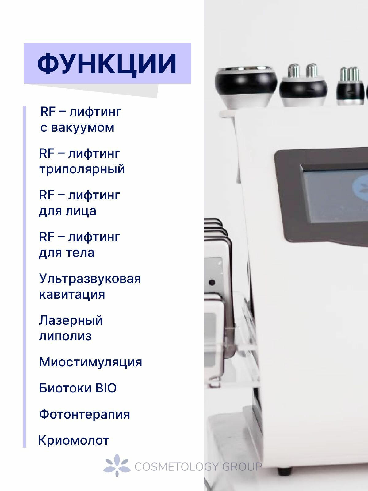 Аппарат косметологический КИМ8 предназначен для профессионального использования в салонах красоты, клиниках эстетической и пластической хирургии, косметологических кабинетах. Аппарат КИМ 8 в модели 10 в 1 – это 10 процедур для достижения идеального результата: кавитация, липолазер, RF-лифтинг для лица и тела, горячий вакуум, контрастный криомолот, биофотон, миостимуляция. Все они помогают врачу косметологу решать большинство проблем, связанных с кожей. Аппарат может быть использован для ухода за кожей лица и тела.