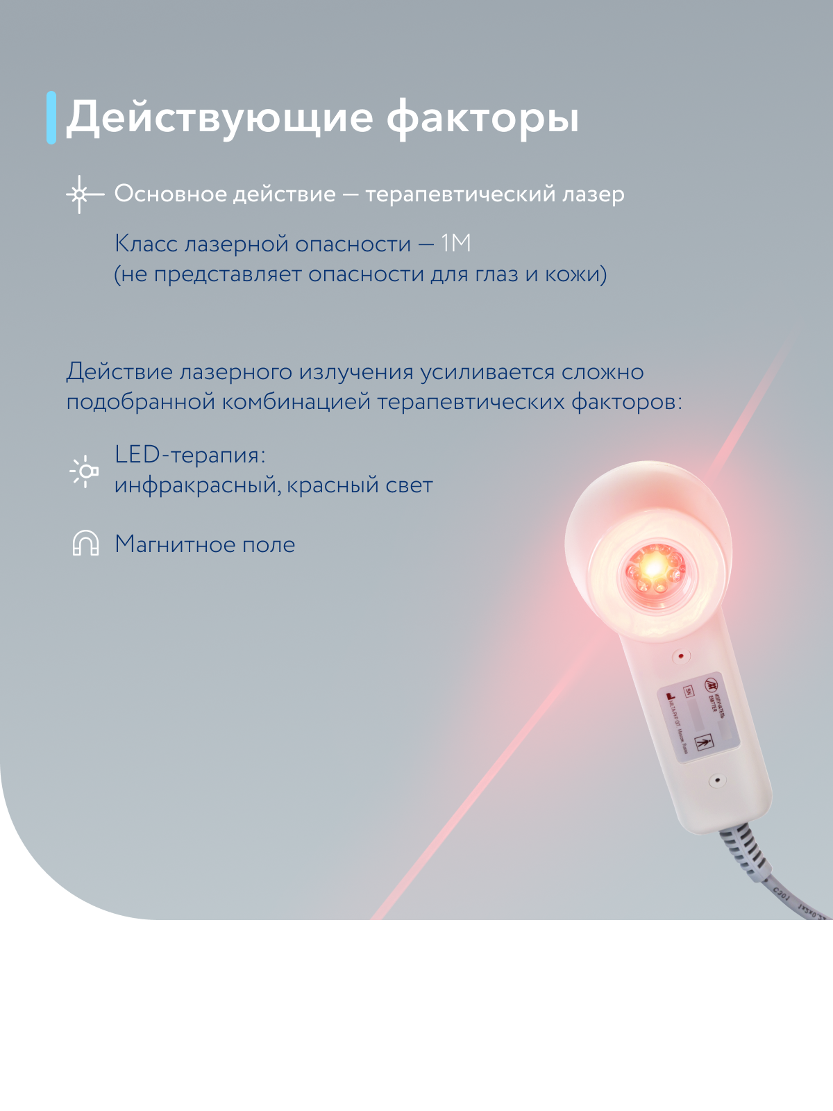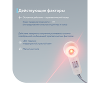 Лечебные факторы аппарата включают инфракрасный лазер с длиной волны 905 нм, пульсирующее инфракрасное излучение, красный свет и постоянное магнитное поле. Эффективность аппарата включает активизацию иммунитета, повышение уровня кислорода в крови, нормализацию биохимических процессов, ускоренную регенерацию тканей, улучшенное кровообращение и противовоспалительный и обезболивающий эффекты.