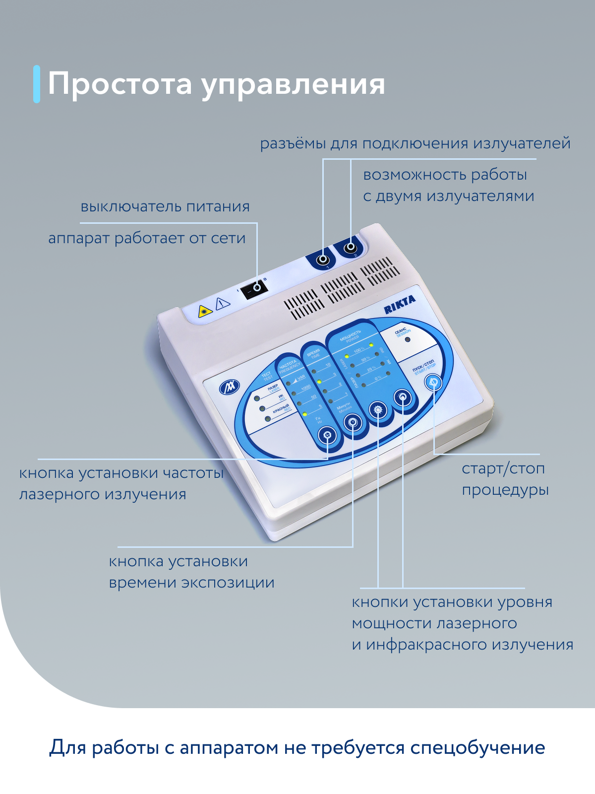 Управление аппаратом осуществляется с помощью кнопочного интерфейса, а особенности включают таймер. Мощность лазерного излучения составляет 16.