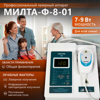 Аппарат лазерной терапии «МИЛТА-Ф-8-01» мощностью 7-9 Вт предназначен для оснащения лечебных учреждений различного профиля. Он оказывает лечебное воздействие на организм пациента, основанное на одновременном или раздельном воздействии тремя физическими факторами: постоянным магнитным полем, импульсным лазерным и постоянным светодиодным излучениями инфракрасного (ИК) диапазона длин волн оптического спектра.