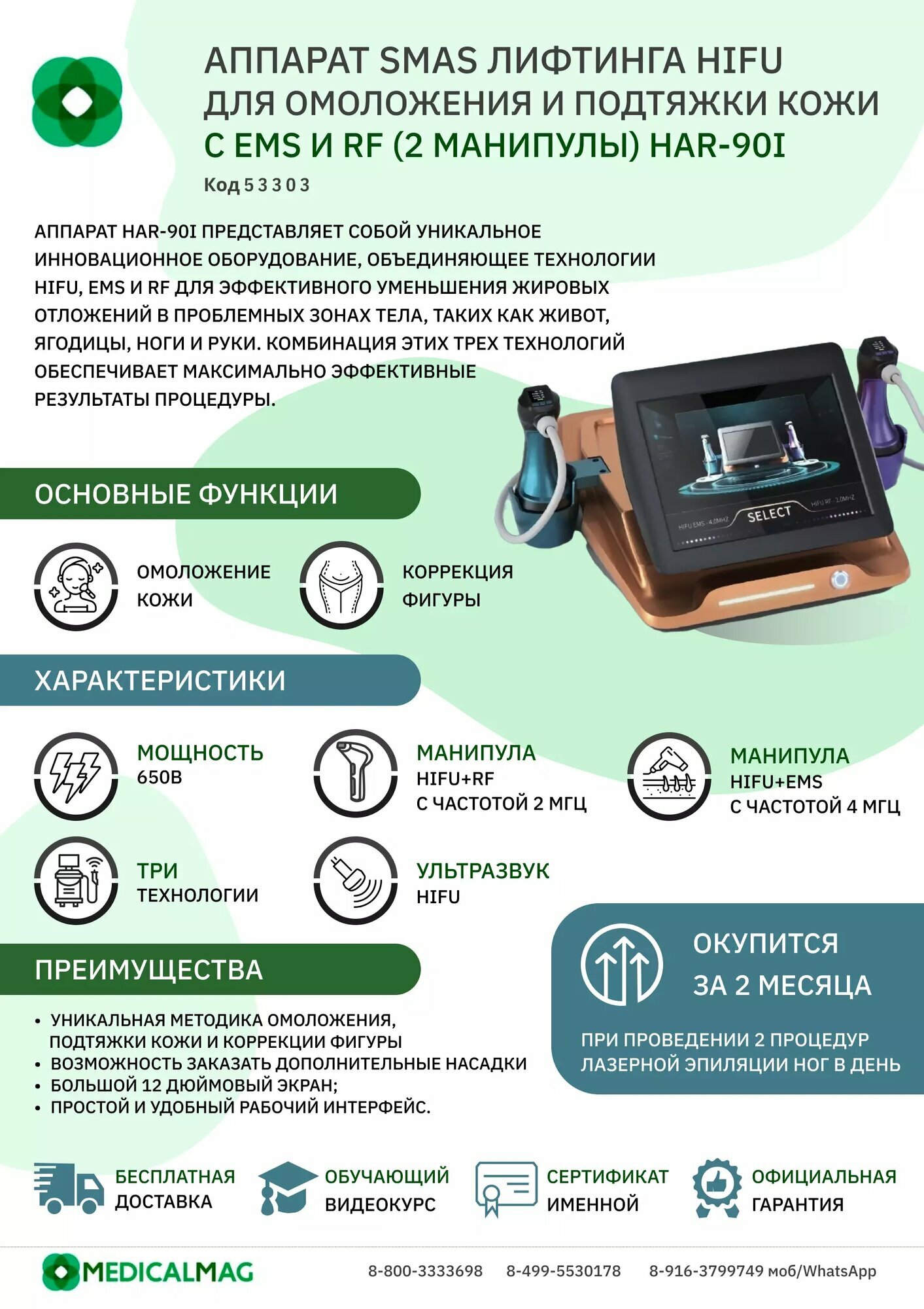 В целом, аппарат HAR-90i предлагает интегрированный и эффективный подход к омоложению, коррекции фигуры и улучшению состояния кожи, помогая клиентам достигать потрясающих результатов.