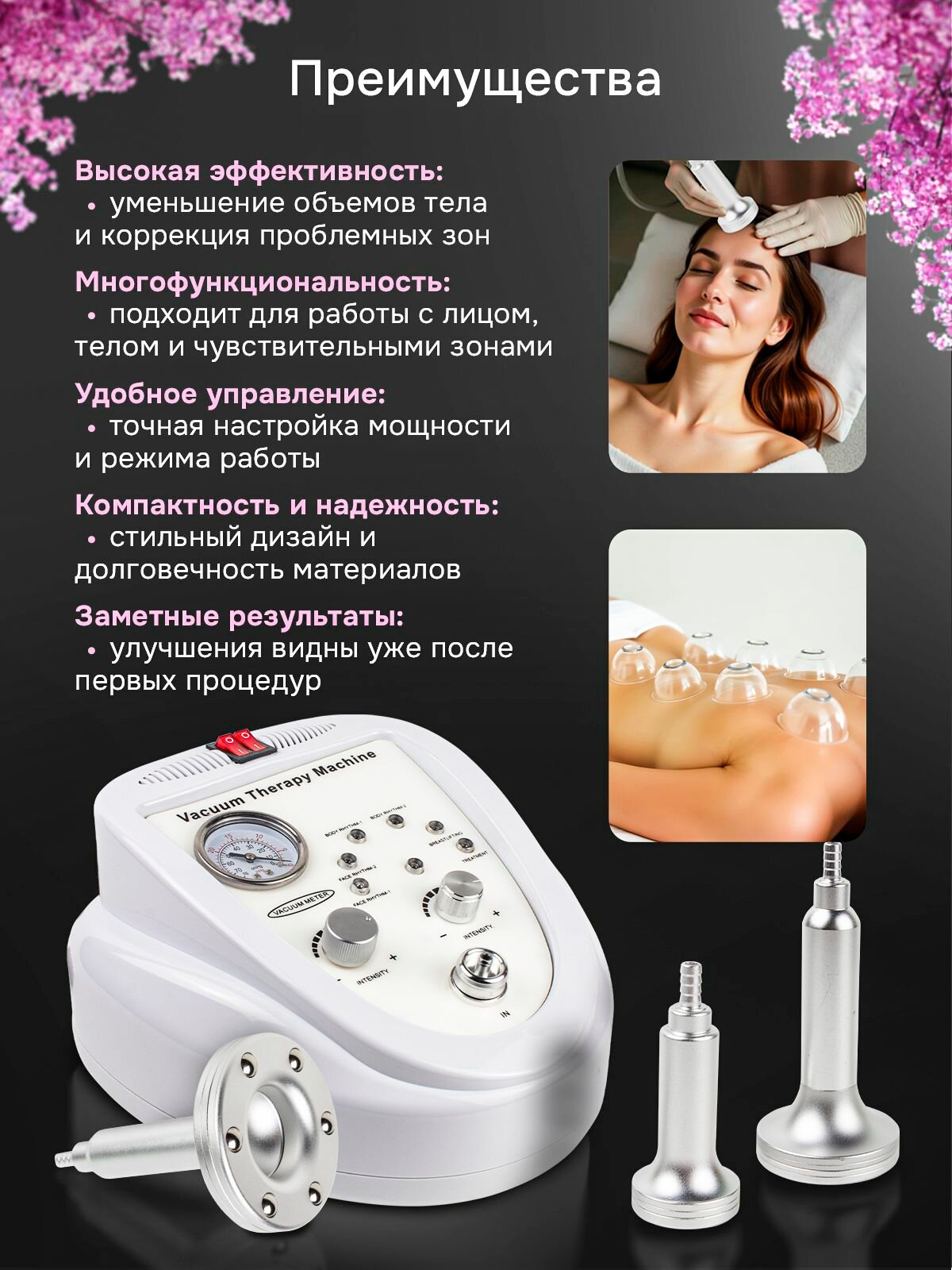 ПОКАЗАНИЯ К ПРИМЕНЕНИЮ • Антицеллюлитный вакуумный массаж любой зоны. • Подтяжка груди, тела и лица. • Улучшение грудной формы. • Излечение жировых отложений и ожирения. • Устранение отечности. • Лимфодренаж тела и лица. • Повышение работоспособности обменных процессов. • Выведение токсинов. Кроме этого, аппарат позволяет максимально быстро избавиться от отечности под глазами, уменьшить выраженность морщин, а также подтянуть обвисшую и дряблую кожу.