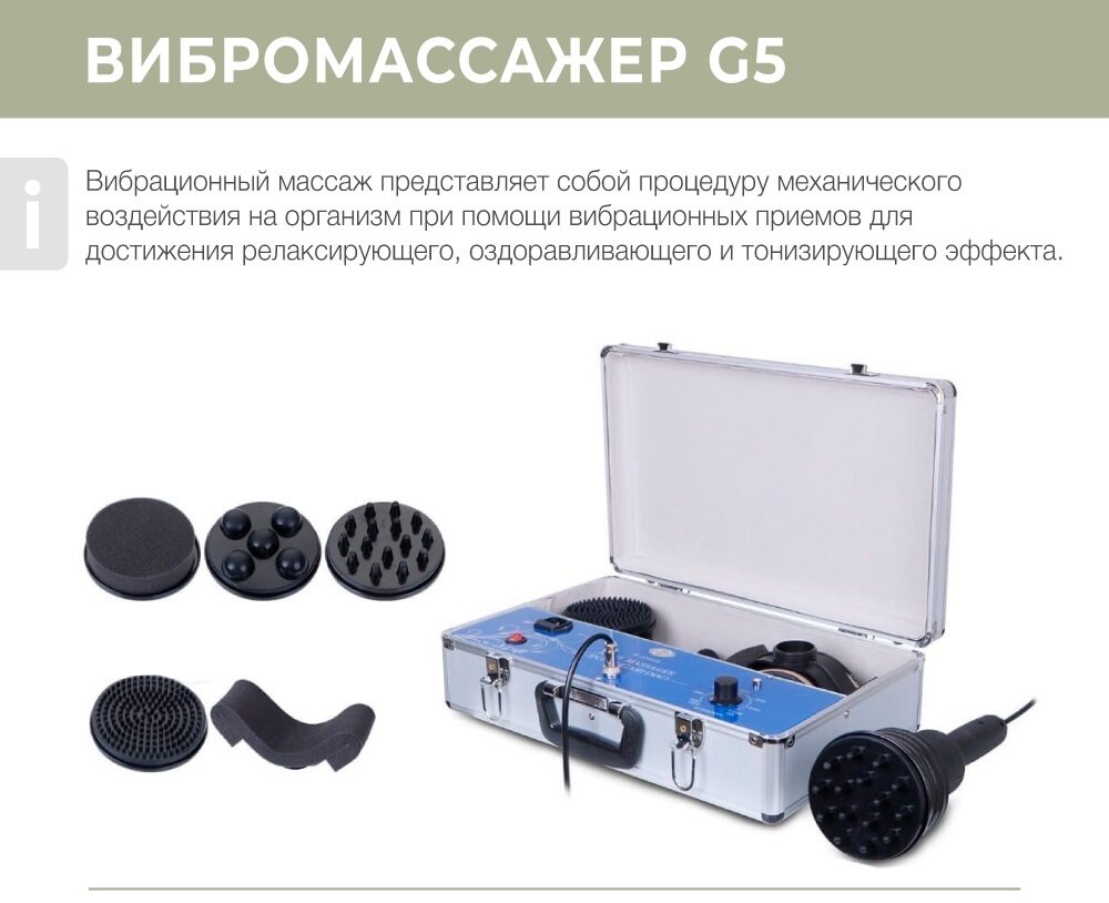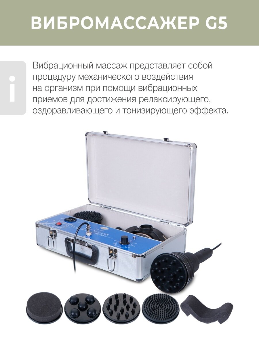 Аппарат вибрационного массажа 5 в 1 Mychway G5 mini предназначен для проведения процедуры вибрационного массажа. Преимущества: аппарат позволяет проводить массаж как всего тела, так и отдельных его частей; аппарат оснащен 5 насадками, что увеличивает возможности проведения массажа; имеется насадка специальной конструкции для проработки шейного отдела; с помощью аппарата прорабатываются не только усталые и зажатые мышцы, но и улучшается внешний вид кожи, уменьшая проявления целлюлита; имеется 3 размера массажных насадок для проработки на различную глубину: чем крупнее, тем глубже и интенсивнее проработка; массажные насадки очень легко прикрепляются к манипуле; аппарат отлично оздоравливает, ободряет в силу того, что усиливается приток крови по всему телу, все зажатые мышцы расслабляются, исчезают отеки, улучшается общее самочувствие. Технические характеристики - Мощность аппарата: 260Вт - Вибрация: до 4000 оборотов в минуту - Время: от 10 до 30 минут.