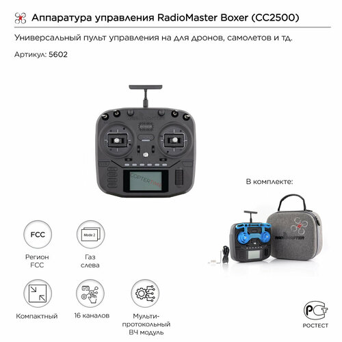 RadioMaster Boxer работает в диапазоне частот 2.400–2.480 ГГц с частотой обновления до 1000 Гц , что обеспечивает быстрый и надежный сигнал управления. Мощность передатчика достигает 30 дБм (до 1000 мВт) , что гарантирует стабильную связь даже на больших расстояниях.