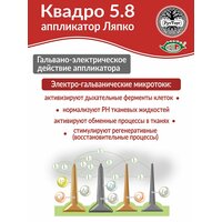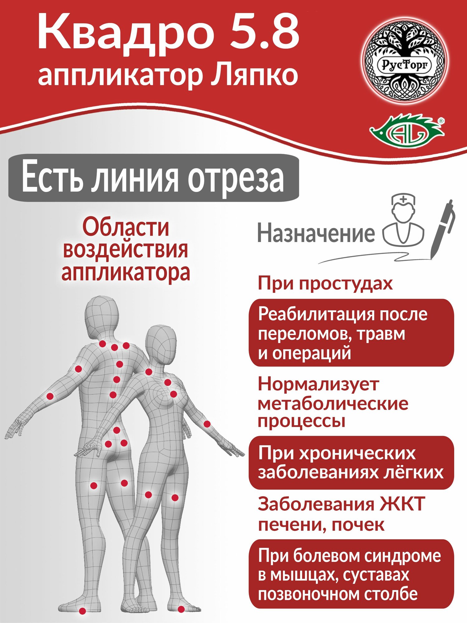 Устройство аппликационное Ляпко "Квадро", шаг иглы - 5,8, размер - 118х470 мм, кол-во игл -1780. Состав: железо, медь, никель, цинк, серебро, резина медицинского назначения. Является универсальным аппликатором и может применяться на любые зоны. При желании может быть разрезан продольно или поперечно на 2 или 4 аппликатора для избирательного действия на отдельные зоны тела с индивидуальной регулировкой длительности воздействия каждого аппликатора.