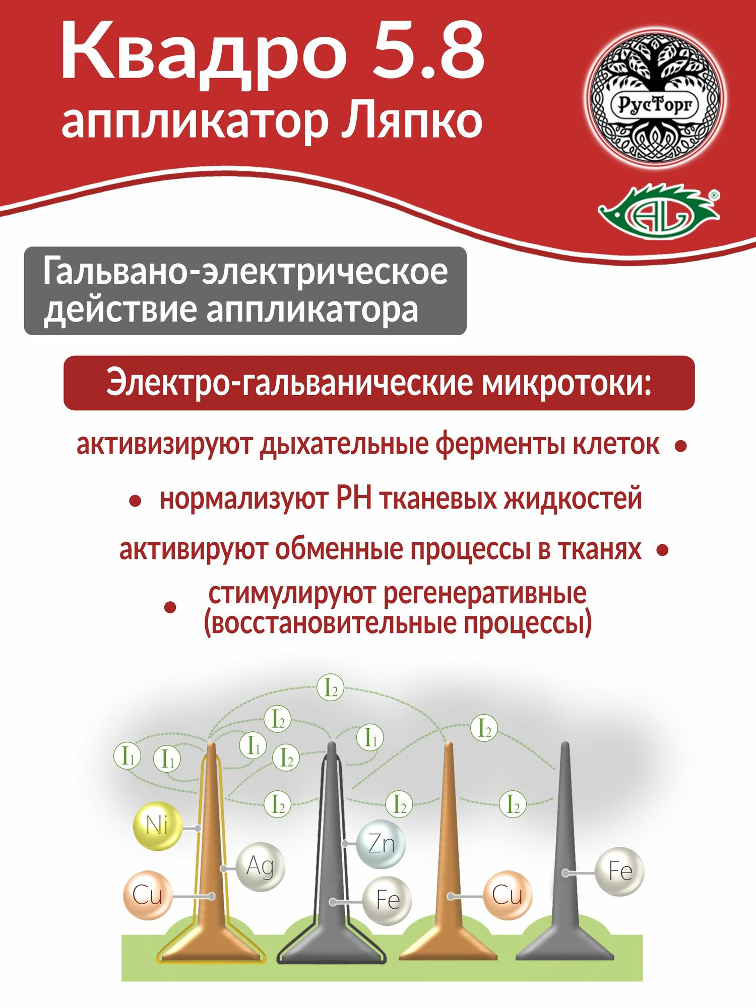 Аппликаторы Ляпко — это эластичные пластины, валики и пояса, иглы которых изготовлены из необходимых для организма металлов: цинка, меди, железа, никеля и серебра. Высокая эффективность оздоровления достигается за счет возникающих в коже, на остриях игл и между ними гальванических токов.
