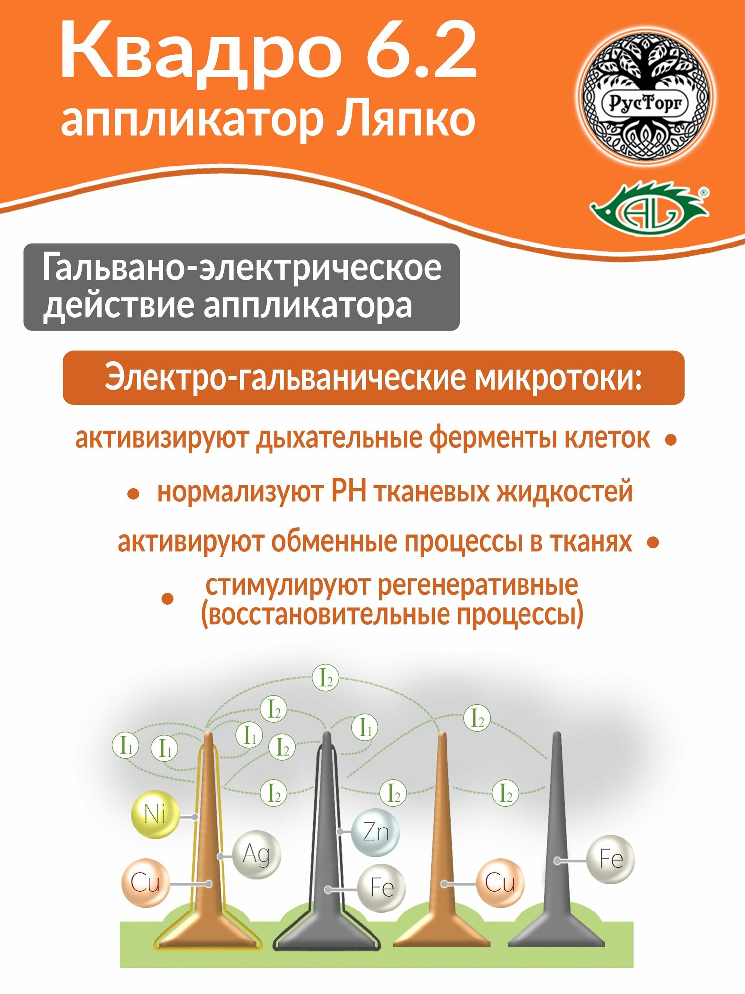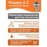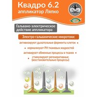 Устройство аппликационное Ляпко Квадро, шаг иглы - 6,2 мм, размер - 117х471 мм, кол-во игл - 1500. Состав: железо, медь, никель, цинк, серебро, резина медицинского назначения. Аппликатор Ляпко Квадро выпускается с расстоянием шага игл 4.9, 5.8 и 6.2 мм. Шаг игл выбирается в зависимости от возраста человека, и в зависимости от чувствительности кожи. Производитель рекомендует людям в возрасте старше сорока пяти лет использовать шаг иглы 6.2 и выше, а младше сорока пяти лет 5.8 и ниже, но это не принципиально так как если у человека очень чувствительная кожа, то можно и отступить от этого правила и приобрести аппликатор с шагом иглы меньшего размера.