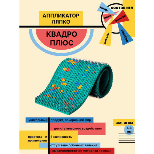 Устройство аппликационное Ляпко «Квадро» имеет шаг иглы - 5,8 мм, размер - 118х470 мм, кол-во игл – 1780. Является универсальным аппликатором и может применяться на любые зоны. При желании может быть разрезан продольно и/или поперечно на 2 или 4 аппликатора для избирательного действия на отдельные зоны тела с индивидуальной регулировкой длительности воздействия каждого аппликатора. Основным преимуществом данного коврика является его размер, который позволяет удобно воздействовать на большие продольные мышцы вдоль позвоночника, на шейный отдел, тазобедренную часть, вдоль рук и ног, на ладони и стопы.