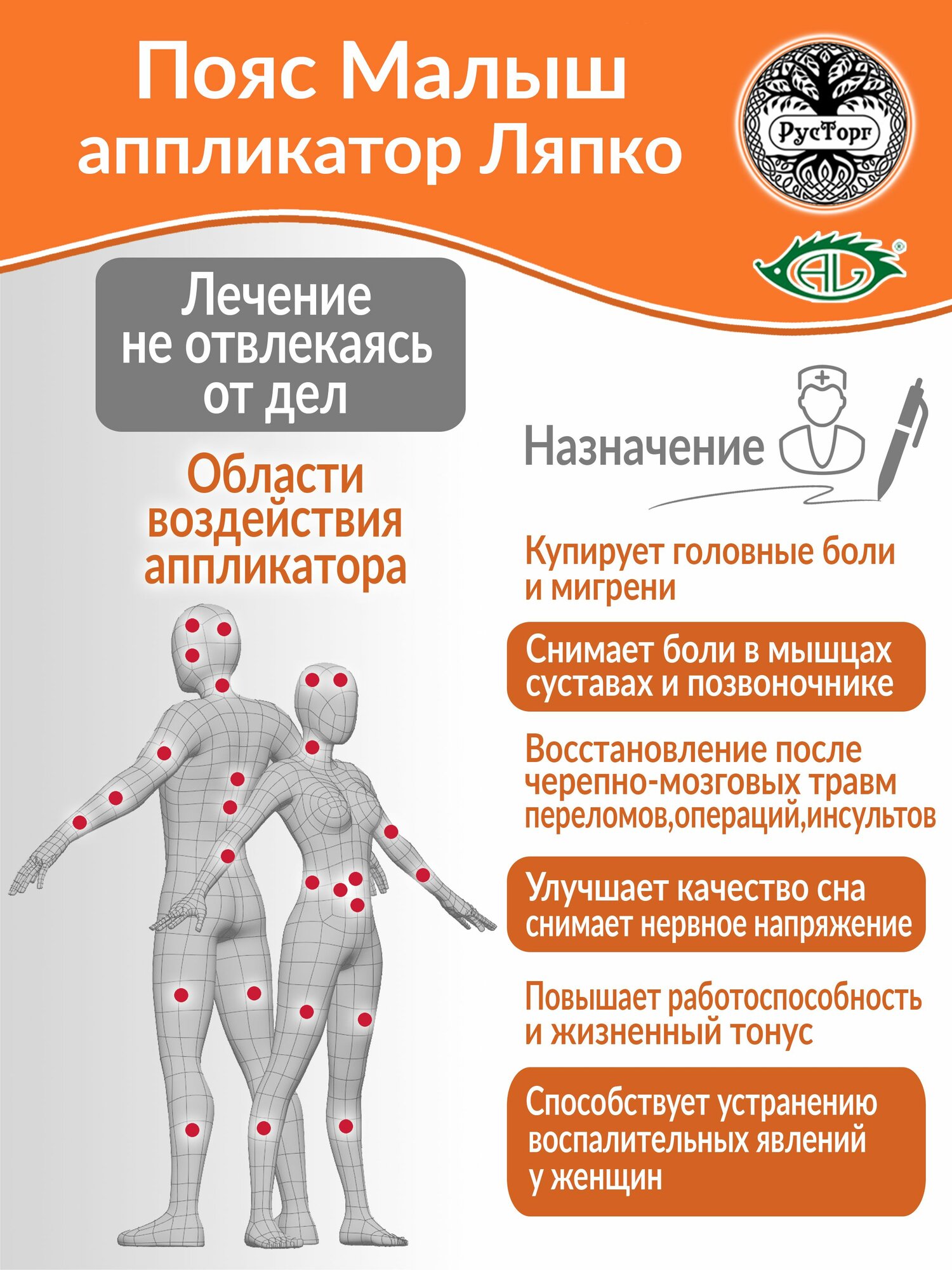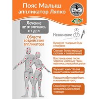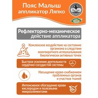 Устройство аппликационное Ляпко плоское "Пояс малыш" состоит из 6 пластин и 2 регулируемых поясов, кол-во игл - 960. Размер каждой пластины - 36x84 мм. Благодаря надёжным фиксаторам крепится на проблемные зоны. У вас много забот и нет времени применить аппликатор Ляпко? Хотите применять аппликатор Ляпко, но некогда лежать на нём? Устройство-пояс решит эти проблемы. Фиксаторы обеспечивают равномерный прижим аппликатора к поверхности тела и дают возможность двигаться, продолжать начатое дело и в то же время получать лечение. Фиксировать аппликатор-пояс можно самостоятельно, без посторонней помощи - легко, быстро, надежно и на любых участках туловища, конечностей, суставов. Для этого предусмотрена регулировка длины пояса. Благодаря надёжным фиксаторам, пояс крепится непосредственно на зону боли, зону отраженной боли, на зону иррадиации боли или зону проекции больного органа, зону расположения биологически активных точек и меридианов.