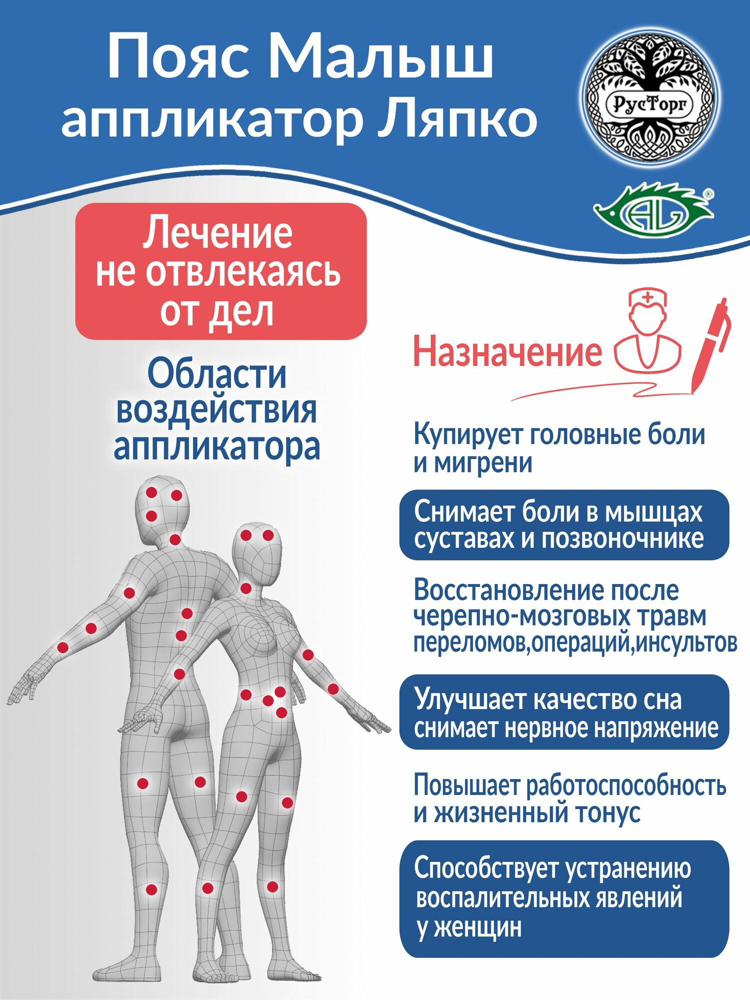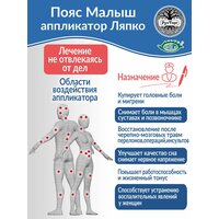 Устройство аппликационное Ляпко плоское "Пояс малыш" состоит из 6 пластин и 2 регулируемых поясов, кол-во игл - 960. Размер каждой пластины - 36x84 мм. Благодаря надёжным фиксаторам крепится на проблемные зоны. У вас много забот и нет времени применить аппликатор Ляпко? Хотите применять аппликатор Ляпко, но некогда лежать на нём? Устройство-пояс решит эти проблемы. Фиксаторы обеспечивают равномерный прижим аппликатора к поверхности тела и дают возможность двигаться, продолжать начатое дело и в то же время получать лечение. Фиксировать аппликатор-пояс можно самостоятельно, без посторонней помощи - легко, быстро, надежно и на любых участках туловища, конечностей, суставов. Для этого предусмотрена регулировка длины пояса. Благодаря надёжным фиксаторам, пояс крепится непосредственно на зону боли, зону отраженной боли, на зону иррадиации боли или зону проекции больного органа, зону расположения биологически активных точек и меридианов.